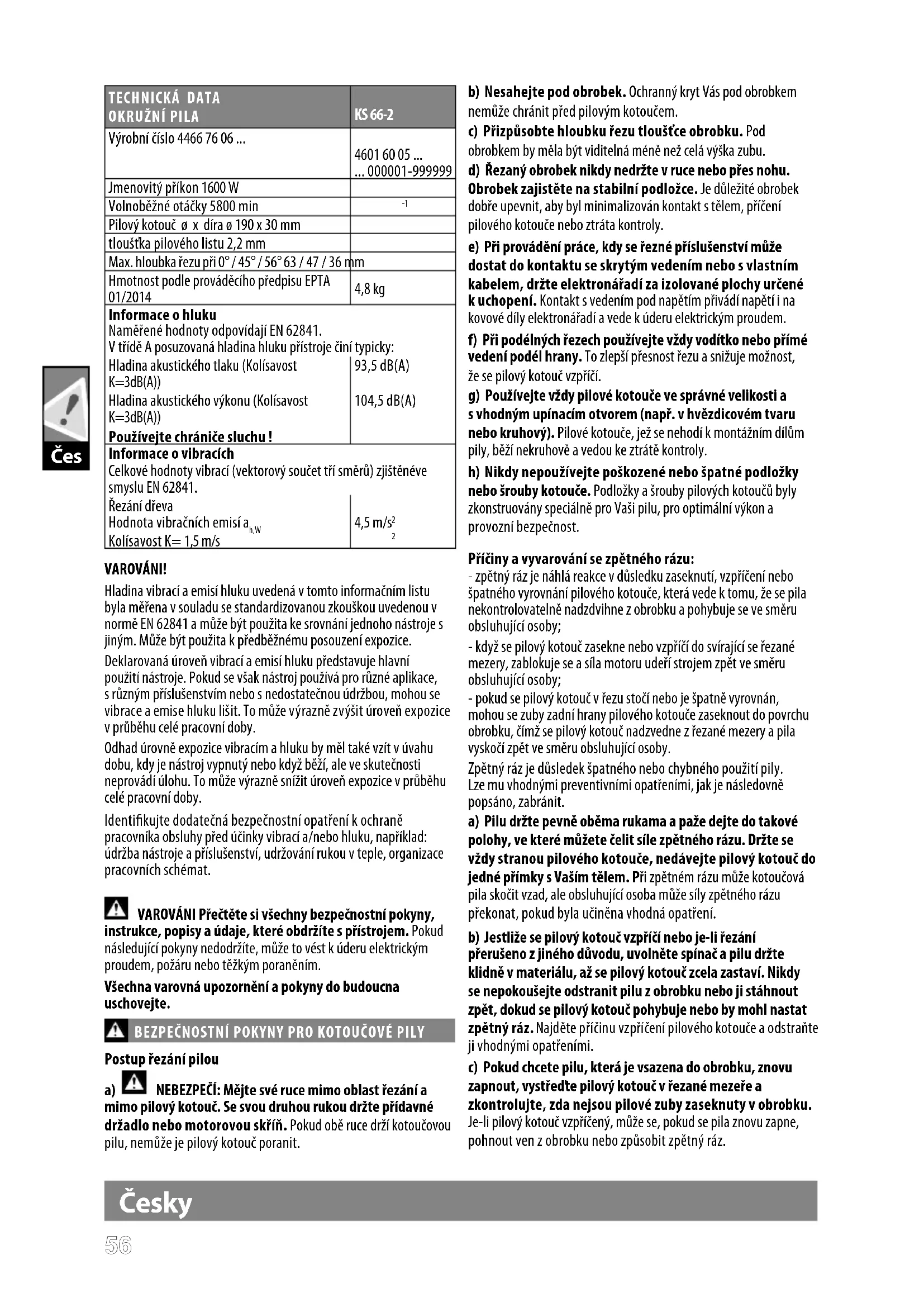 Pilový kotouč ø x díra ø 190 x 30 mm tloušťka pilového listu 2,2 mm Max. hloubka řezu při 0° / 45° / 56° 63 / 47 / 36 mm Hmotnost podle prováděcího předpisu EPTA 01/2014 4,8 kg Informace o hluku Naměřené hodnoty odpovídají EN 62841. V třídě A posuzovaná hladina hluku přístroje činí typicky: Hladina akustického tlaku (Kolísavost K=3dB(A)) 93,5 dB(A) Hladina akustického výkonu (Kolísavost K=3dB(A)) 104,5 dB(A) Používejte chrániče sluchu ! Informace o vibracích Celkové hodnoty vibrací (vektorový součet tří směrů) zjištěnéve smyslu EN 62841. Řezání dřeva Hodnota vibračních emisí a h,W 4,5 m/s