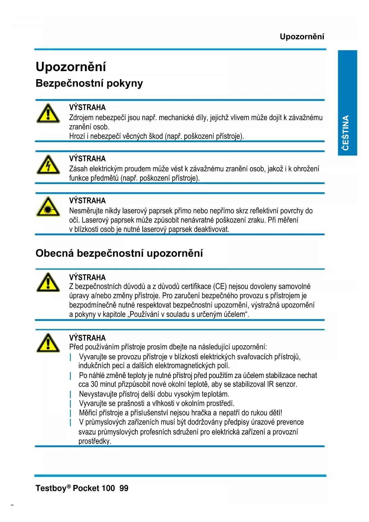 VÝSTRAHA Před používáním přístroje prosím dbejte na následující upozornění: | Vyvarujte se provozu přístroje v blízkosti elektrických svařovacích přístrojů, indukčních pecí a dalších elektromagnetických polí. | Po náhlé změně teploty je nutné přístroj před použitím za účelem stabilizace nechat cca 30 minut přizpůsobit nové okolní teplotě, aby se stabilizoval IR senzor. | Nevystavujte přístroj delší dobu vysokým teplotám. | Vyvarujte se prašnosti a vlhkosti v okolním prostředí. | Měřicí přístroje a příslušenství nejsou hračka a nepatří do rukou dětí! | V průmyslových zařízeních musí být dodržovány předpisy úrazové prevence svazu průmyslových profesních sdružení pro elektrická zařízení a provozní prostředky.Upozornění 100 Testboy
