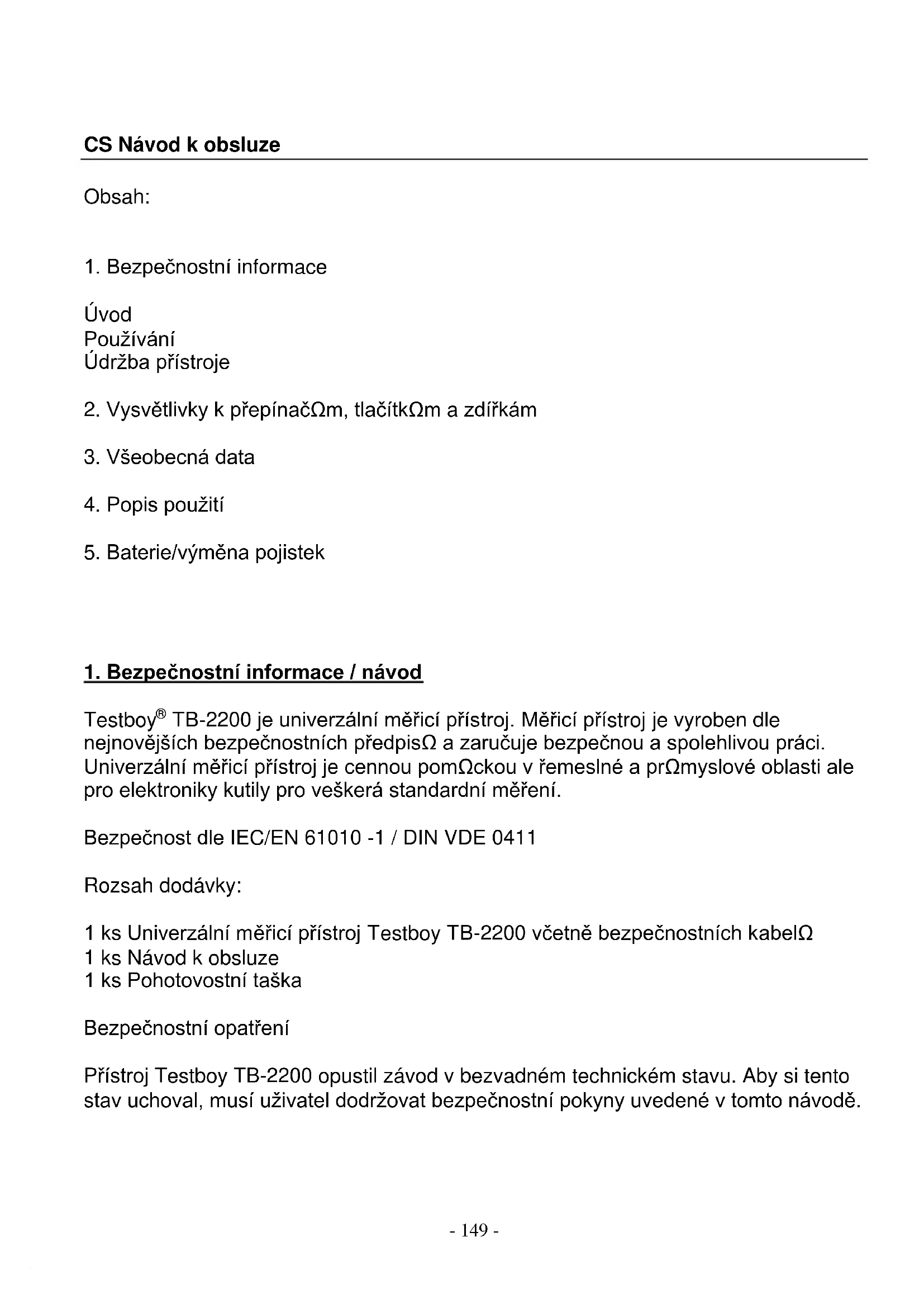 Přistroj Testboy TB-2200 opustil zámov v bezvadné technickém stavu. Aby si tento stav uchoval, musí uživatel dodržovat bezpečnostní poukyny uvedené v tomto námodě.
