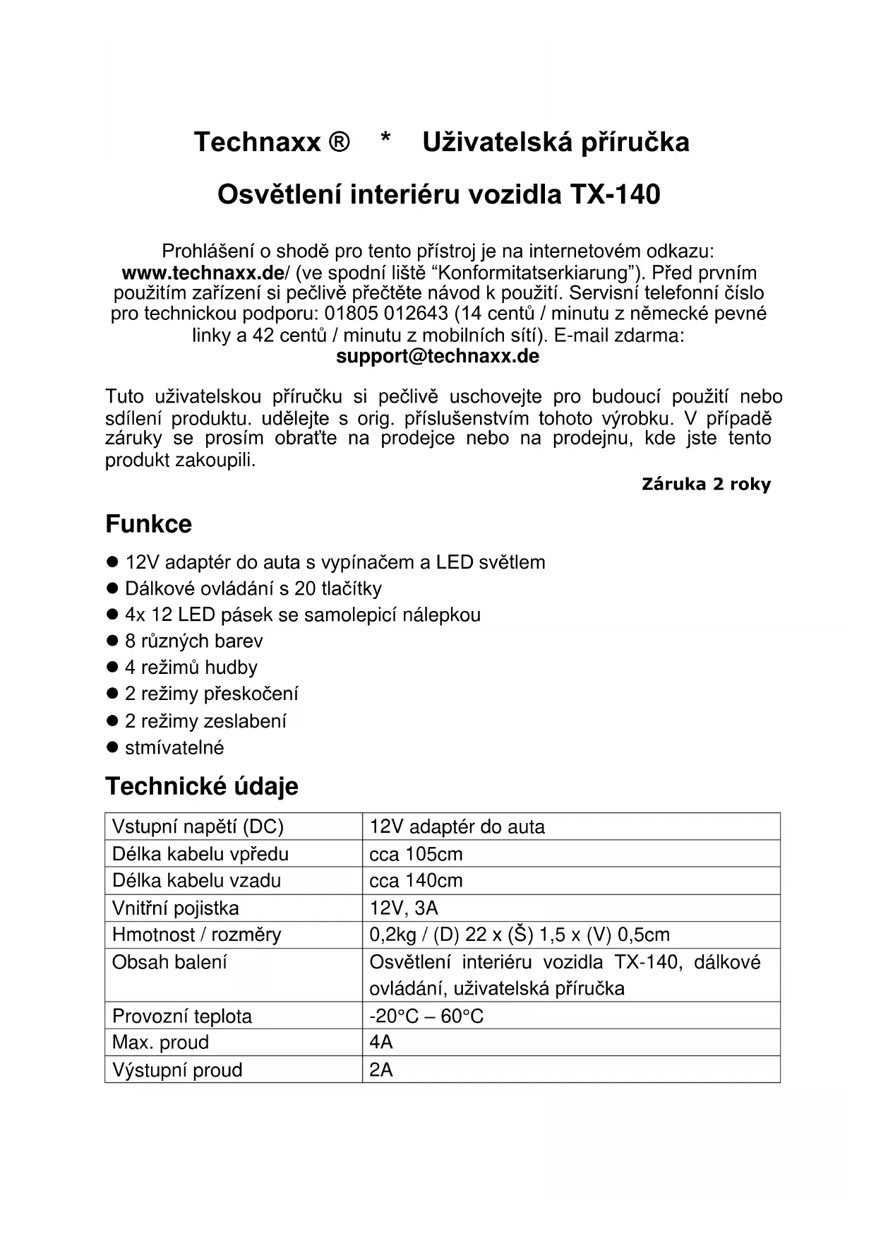 7 barvy se mění FADE (ZTLUM ENÍ) 3 3 barvy se postupně mění FADE (ZTLUM ENÍ) 7 7 barvy se postupně měníToto zařízení není určeno k použití dětmi nebo osobami s omezenou mentální schopností nebo nedostatkem zkušeností a / nebo chybějícími odbornými znalostmi. Na děti by se mělo dohlížet, aby se zajistilo, že si nebudou hrát s tímto přístrojem. Zařízení není určeno pro komerční použití. Jakékoli jiné použití nebo modifikace zařízení je považováno za nevhodné a představuje významné riziko. Výrobce nepřebírá žádnou odpovědnost za škody způsobené nesprávným použitím. Zamýšlené použití Osvětlení interiéru auta je určeno pouze pro instalaci do Automobilů (a nákladních automobilů) Karavanů lodí s 12V bateriemi. Neumisťujte osvětlení interiéru vozidla: V blízkosti zdrojů tepla (radiátory, přímé sluneční světlo), hořlavých materiálů, prostoru pro baterie nebo startovací baterie, Vlhká místa nebo místa vystavená kapající nebo stříkající vodě, V prostředí s nebezpečím výbuchu Instalace Instalace osvětlení interiéru vozidla TX-140 lze provést pod nástěnnou deskou, do kufru nebo pod sedadly. Před nalepením LED pásů se ujistěte, že kabely lze pokládat čistě a že nehrozí žádné zakopnutí. Produkt nesmí řidiči ani cestujícím v žádném případě bránit. Před připojením proužků LED vyčistěte oblast, abyste zajistili bezpečné připojení. Instalace by měla být provedena tak, aby nebyl řidič ani ostatní účastníci silničního provozu oslněni nebo podrážděni osvětlením. Upozornění & varování POUŽITÍ POUZE V INTERIÉRU. Tyto výrobky nemají ECE schválení, tj. nesmějí být ve vozidle používány pro venkovní použití na veřejných komunikacích. Používání na veřejných komunikacích vede k zániku provozní licence a ke ztrátě pojistného krytí. V mnoha zemích je distribuce a používání těchto produktů zakázáno. Informace o dostupnosti ve vaší zemi získáte od místního distributora Použití zařízení pro záchranu života, kde lze předpokládat, že porucha zařízení může způsobit poruchu vybavení pro záchranu života nebo významně ovlivnit jeho bezpečnost nebo účinnost, není doporučeno. Nepoužívejte zařízení v přítomnosti hořlavé anestetické směsi se vzduchem, kyslíkem nebo oxidem dusnatým a také v blízkosti hořlavých materiálů, kouřenebo plynů. Nepracujte v blízkosti větracích otvorů automobilu nebo na přímém slunečním světle. Po celou dobu uchovávejte zařízení v suchu, a když se nepoužívá, odpojte ho. Vypněte připojené vybavení před (!) spouštěním motoru. Rady pro ochranu životního prostředí: Obalové materiály jsou surovinami a lze je recyklovat. Nevyhazujte stará zařízení či baterie do domovního odpadu. Čištění: Chraňte zařízení před kontaminací a znečištěním (použijte čistou přikrývku). Vyhněte se používání hrubých, abrazivních čistících prášků a rozpouštědel nebo agresívních čistidel. Zařízení po vyčištění dobře otřete. Distributor: Technaxx Deutschland GmbH & Co.KG, Kruppstr. 105, 60388 Frankfurt a.M., Německo