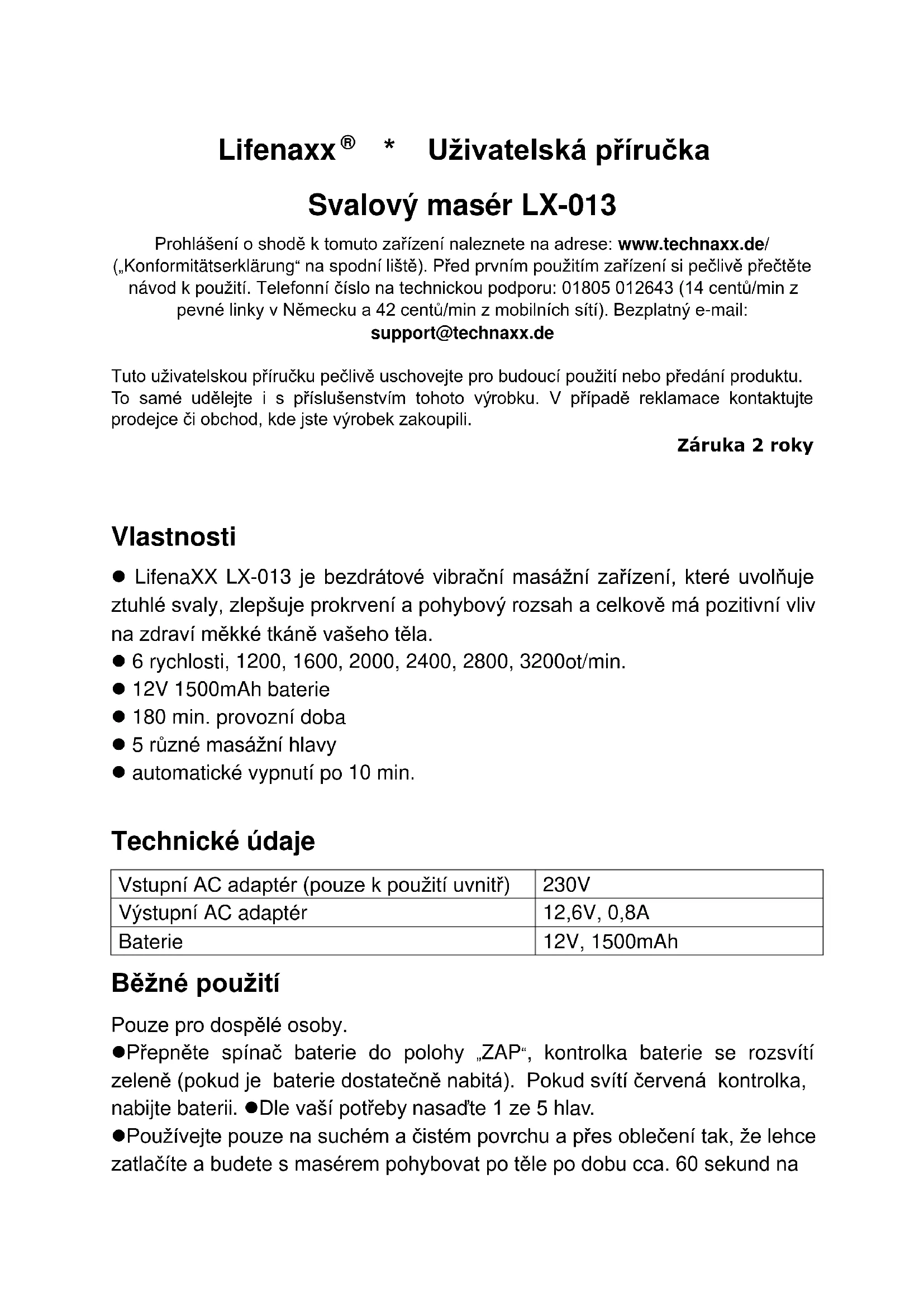 - Uživatelská příručka Svalový masér LX-013 Prohlášení o shodě k tomuto zařízení naleznete na adrese: www.technaxx.de/ („Konformitätserklärung“ na spodní liště). Před prvním použitím zařízení si pečlivě přečtěte návod k použití. Telefonní číslo na technickou podporu: 01805 012643 (14 centů/min z pevné linky v Německu a 42 centů/min z mobilních sítí). Bezplatný e-mail: support@technaxx.de Tuto uživatelskou příručku pečlivě uschovejte pro budoucí použití nebo předání produktu. To samé udělejte i s příslušenstvím tohoto výrobku. V případě reklamace kontaktujte prodejce či obchod, kde jste výrobek zakoupili. Záruka 2 roky