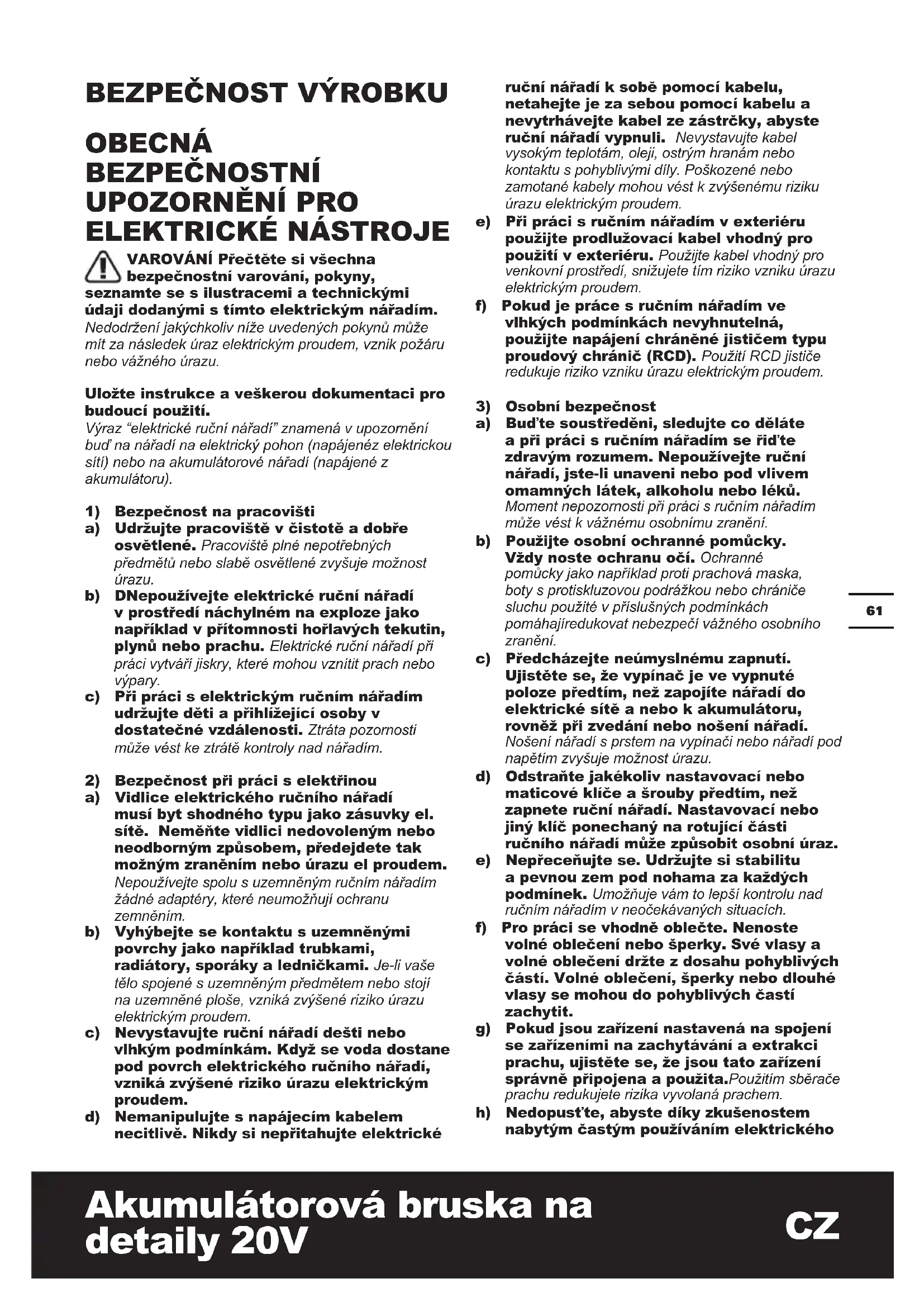 VAROVÁNÍ Přečtěte si všechna bezpečnostní varování, pokyny, seznamte se s ilustracemi a technickými údaji dodanými s tímto elektrickým nářadím. Nedodržení jakýchkoliv níže uvedených pokynů může mít za následek úraz elektrickým proudem, vznik požáru nebo vážného úrazu. Uložte instrukce a veškerou dokumentaci pro budoucí použití. Výraz “elektrické ruční nářadí” znamená v upozornění buď na nářadí na elektrický pohon (napájenéz elektrickou sítí) nebo na akumulátorové nářadí (napájené z akumulátoru).