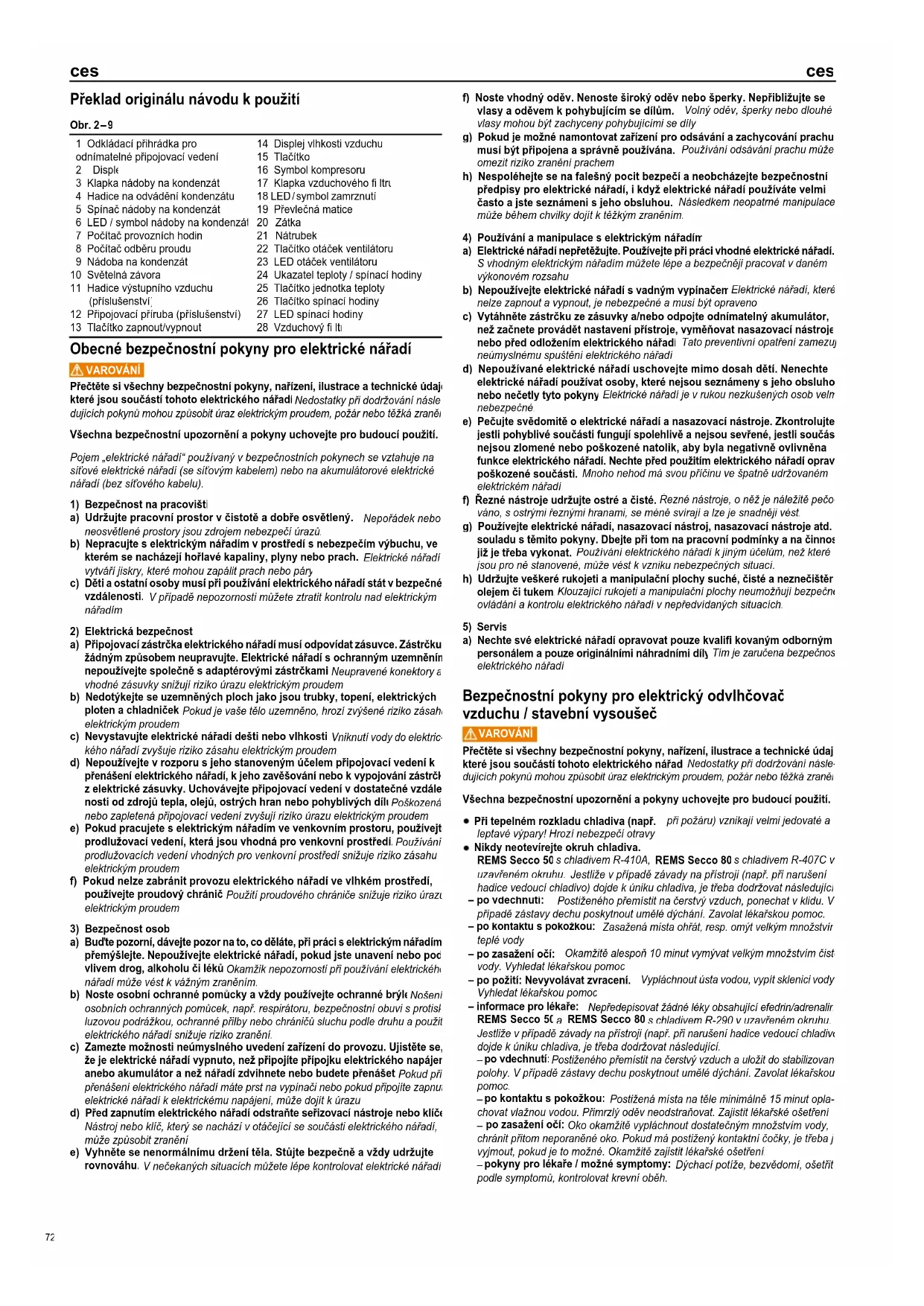 Nikdy neotevírejte okruh chladiva. REMS Secco 50 s chladivem R-410A, REMS Secco 80 s chladivem R-407C v uzavřeném okruhu. Jestliže v případě závady na přístroji (např. při narušení hadice vedoucí chladivo) dojde k úniku chladiva, je třeba dodržovat následující: – po vdechnutí: Postiženého přemístit na čerstvý vzduch, ponechat v klidu. V případě zástavy dechu poskytnout umělé dýchání. Zavolat lékařskou pomoc. – po kontaktu s pokožkou: Zasažená místa ohřát, resp. omýt velkým množstvím teplé vody. – po zasažení očí: Okamžitě alespoň 10 minut vymývat velkým množstvím čisté vody. Vyhledat lékařskou pomoc. – po požití: Nevyvolávat zvracení. Vypláchnout ústa vodou, vypít sklenici vody. Vyhledat lékařskou pomoc. – informace pro lékaře: Nepředepisovat žádné léky obsahující efedrin/adrenalin. REMS Secco 50