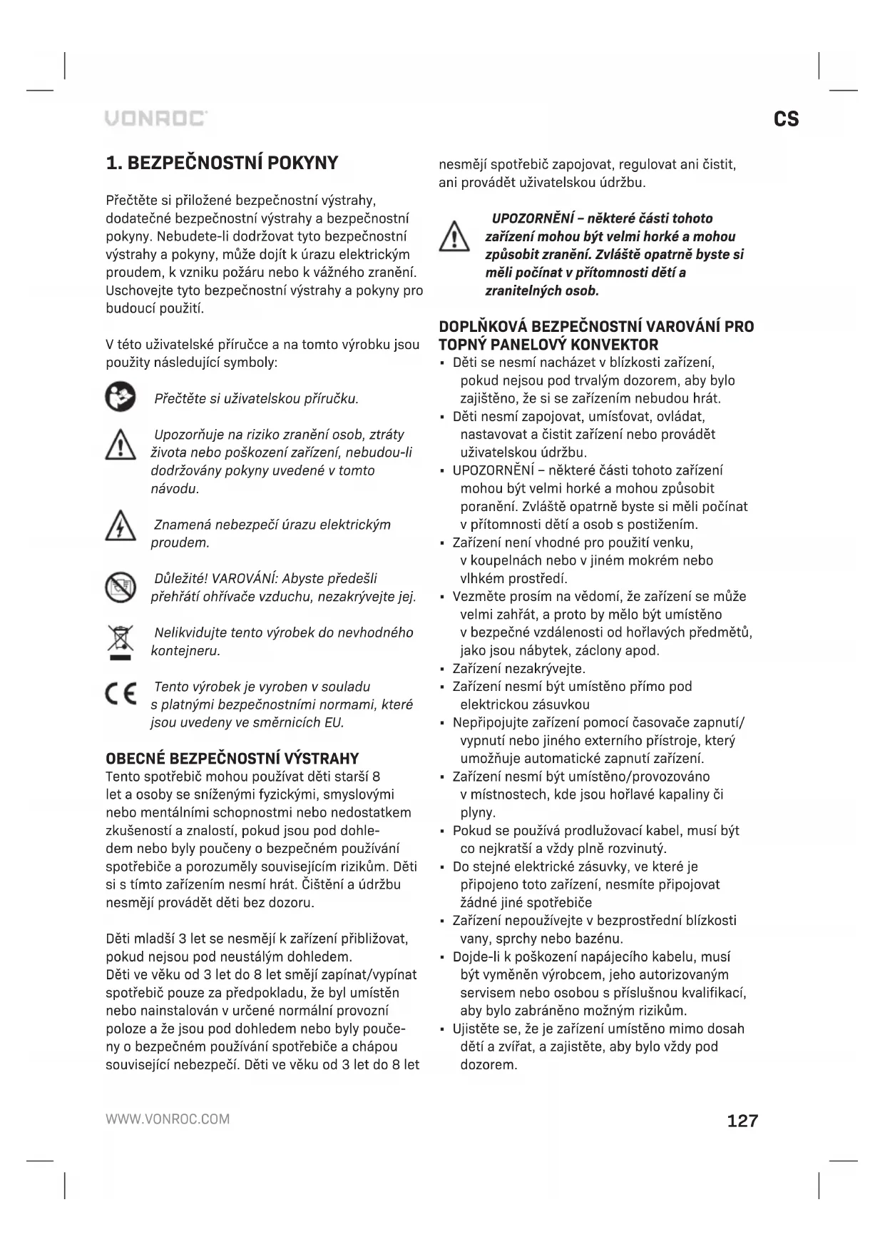 Tento spotřebič mohou používat děti starší 8 let a osoby se sníženými fyzickými, smyslovými nebo mentálními schopnostmi nebo nedostatkem zkušeností a znalostí, pokud jsou pod dohle- dem nebo byly poučeny o bezpečném používání spotřebiče a porozuměly souvisejícím rizikům. Děti si s tímto zařízením nesmí hrát. Čištění a údržbu nesmějí provádět děti bez dozoru. Děti mladší 3 let se nesmějí k zařízení přibližovat, pokud nejsou pod neustálým dohledem. Děti ve věku od 3 let do 8 let smějí zapínat/vypínat spotřebič pouze za předpokladu, že byl umístěn nebo nainstalován v určené normální provozní poloze a že jsou pod dohledem nebo byly pouče- ny o bezpečném používání spotřebiče a chápou související nebezpečí. Děti ve věku od 3 let do 8 let nesmějí spotřebič zapojovat, regulovat ani čistit, ani provádět uživatelskou údržbu. UPOZORNĚNÍ – některé části tohoto zařízení mohou být velmi horké a mohou způsobit zranění. Zvláště opatrně byste si měli počínat v přítomnosti dětí a zranitelných osob. DOPLŇKOVÁ BEZPEČNOSTNÍ VAROVÁNÍ PRO
