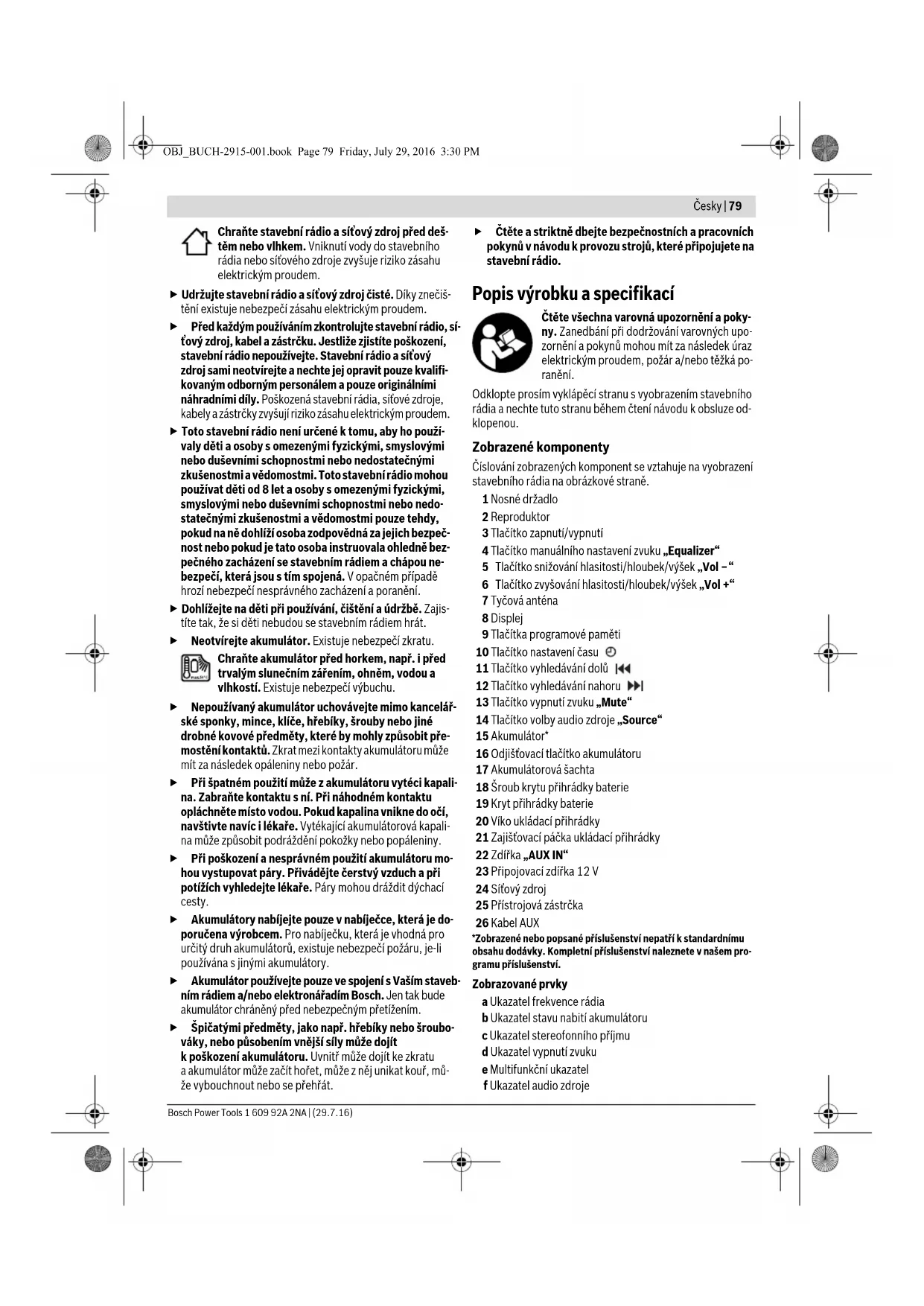 Akumjulator jest zbyt rozgrza- ny lub zbyt zimny Odczekać, aby akumulator osiągnął właściwą tempera- turę roboczą Radioodbiornik nieoczekiwanie przestaje działać Zasilacz lub akumulator nie zostały zamocowane, lub uczyniono to niedokładnie Całkowicie włożyć zasilacz względnie akumulator Zły odbiór radiowy Zakłócenia spowodowane in- nymi urządzeniami lub nieko- rzystnymi warunkami w miejscu umieszczenia ra- dioodbiornika Umieścić radioodbiornik w innym miejscu, gdzie jest lep- szy odbiór względnie zacho- wać większy odstęp do in- nych urządzeń elektronicz- nych Zakłócenia w wyświetlaniu czasu Baterie buforowe dla zegara wyładowały się Wymienić baterie buforowe Niewłaściwie ułożone baterie (bieguny) Baterie buforowe ułożyć we wnęce zważając na zacho- wanie właściwej biegunowo- ści Przyczyna Usuwanie błędu OBJ_BUCH-2915-001.book Page 77 Friday, July 29, 2016 3:30 PM78 | Česky 1 609 92A 2NA | (29.7.16) Bosch Power Tools Obsługa klienta oraz doradztwo dotyczące użyt- kowania W punkcie obsługi klienta można uzyskać odpowiedzi na pyta- nia dotyczące napraw i konserwacji nabytego produktu, a tak- że dotyczące części zamiennych. Rysunki rozłożeniowe oraz informacje dotyczące części zamiennych można znaleźć rów- nież pod adresem: www.bosch-pt.com Nasz zespół doradztwa dotyczącego użytkowania odpowie na wszystkie pytania związane z produktami firmy Bosch oraz ich osprzętem. Przy wszystkich zgłoszeniach oraz zamówieniach części za- miennych konieczne jest podanie 10-cyfrowego numeru kata- logowego, znajdującego się na tabliczce znamionowej pro- duktu. Polska Robert Bosch Sp. z o.o. Serwis Elektronarzędzi Ul. Szyszkowa 35/37 02-285 Warszawa Na www.bosch-pt.pl znajdą Państwo wszystkie szczegóły do- tyczące usług serwisowych online. Tel.: 22 7154460 Faks: 22 7154441 E-Mail: bsc@pl.bosch.com Infolinia Działu Elektronarzędzi: 801 100900 (w cenie połączenia lokalnego) E-Mail: elektronarzedzia.info@pl.bosch.com www.bosch.pl Transport Załączone w dostawie akumulatory litowo jonowe podlegają wymaganiom przepisów dotyczących towarów niebezpiecz- nych. Akumulatory mogą być transportowane drogą lądową przez użytkownika bez konieczności spełnienia jakichkolwiek dalszych warunków. W przypadku przesyłki przez osoby trzecie (np. transport dro- gą powietrzną lub za pośrednictwem firmy spedycyjnej) nale- ży dostosować się do szczególnych wymogów dotyczących opakowania i znaczenia towaru. W takim wypadku podczas przygotowywania towaru do wysyłki należy skonsultować się z ekspertem d/s towarów niebezpiecznych. Akumulatory można wysyłać tylko wówczas, gdy ich obudowa nie jest uszkodzona. Odsłonięte styki należy zakleić, a akumu- lator zapakować w taki sposób, aby nie mógł on się poruszać (przesuwać) w opakowaniu. Należy wziąć też pod uwagę ewentualne przepisy prawa krajo- wego. Usuwanie odpadów Radioodbiornik, części zasilacza, osprzęt i opakowa- nie należy oddać do powtórnego przetworzenia zgod- nego z obowiązującymi przepisami w zakresie ochro- ny środowiska. Radioodbiorników, zasilaczy i akumulatorów/baterii nie wol- no wyrzucać do odpadów domowych! Tylko dla państw należących do UE: Zgodnie z europejską wytyczną 2012/19/UE, niezdatne do użytku narzędzia elektryczne, a zgodnie z europejską wytycz- ną 2006/66/WE uszkodzone lub zużyte aku- mulatory/baterie, należy zbierać osobno i doprowadzić do ponownego przetworzenia zgodnego z zasadami ochrony środowiska. Akumulatory/Baterie: Li-Ion: Proszę stosować się do wskazówek, znajdujących się w rozdziale »Trans- port«, str. 78. Zastrzega się prawo dokonywania zmian. Česky Bezpečnostní upozornění Čtěte všechna bezpečnostní upozorně- ní a pokyny a též informace na zadní straně stavebního rádia. Zanedbání při dodržování bezpeč- nostních upozornění a pokynů mohou zapříčinit zásah elek- trickým proudem, požár a/nebo těžká zranění. Všechna bezpečnostní upozornění a pokyny do budoucna uschovejte. V bezpečnostních upozorněních použitý pojem „stavební rádio“ se vztahuje na stavební rádia provozovaná na el.síti (se síťovým zdrojem) a na stavební rádia provozovaná na akumulátoru (bez síťového zdroje). Udržujte Vaše pracovní místo čisté a dobře osvětlené. Nepořádek nebo neosvětlené pracovní oblasti mohou vést k úrazům. Síťová zástrčka síťového zdroje musí lícovat se zásuv- kou. Zástrčka nesmí být žádným způsobem pozměně- na. Společně se stavebními rádii nepoužívejte žádné adaptérové zástrčky. Nepozměněné zástrčky a lícující zá- suvky snižují riziko zásahu elektrickým proudem. Dbejte na účel kabelu síťového zdroje, nepoužívejte jej k nošení či zavěšení stavebního rádia nebo k vytažení zástrčky ze zásuvky. Udržujte kabel daleko od tepla, oleje, ostrých hran nebo pohyblivých dílů strojů. Poško- zené nebo zamotané kabely zvyšují riziko zásahu elektric- kým proudem. Pokud provozujete stavební rádio s připojením k elek- trické síti, pak připojovací kabel síťového zdroje zcela odmotejte. Připojovací kabel se jinak může zahřívat. Dbejte na to, aby bylo možné síťovou zástrčku kdykoli vytáhnout. Síťová zástrčka je jediná možnost, jak odpojit stavební rádio od elektrické sítě. VAROVÁNÍ OBJ_BUCH-2915-001.book Page 78 Friday, July 29, 2016 3:30 PMČesky | 79 Bosch Power Tools 1 609 92A 2NA | (29.7.16) Chraňte stavební rádio a síťový zdroj před deš- těm nebo vlhkem. Vniknutí vody do stavebního rádia nebo síťového zdroje zvyšuje riziko zásahu elektrickým proudem. Udržujte stavební rádio a síťový zdroj čisté. Díky znečiš- tění existuje nebezpečí zásahu elektrickým proudem. Před každým používáním zkontrolujte stavební rádio, sí- ťový zdroj, kabel a zástrčku. Jestliže z