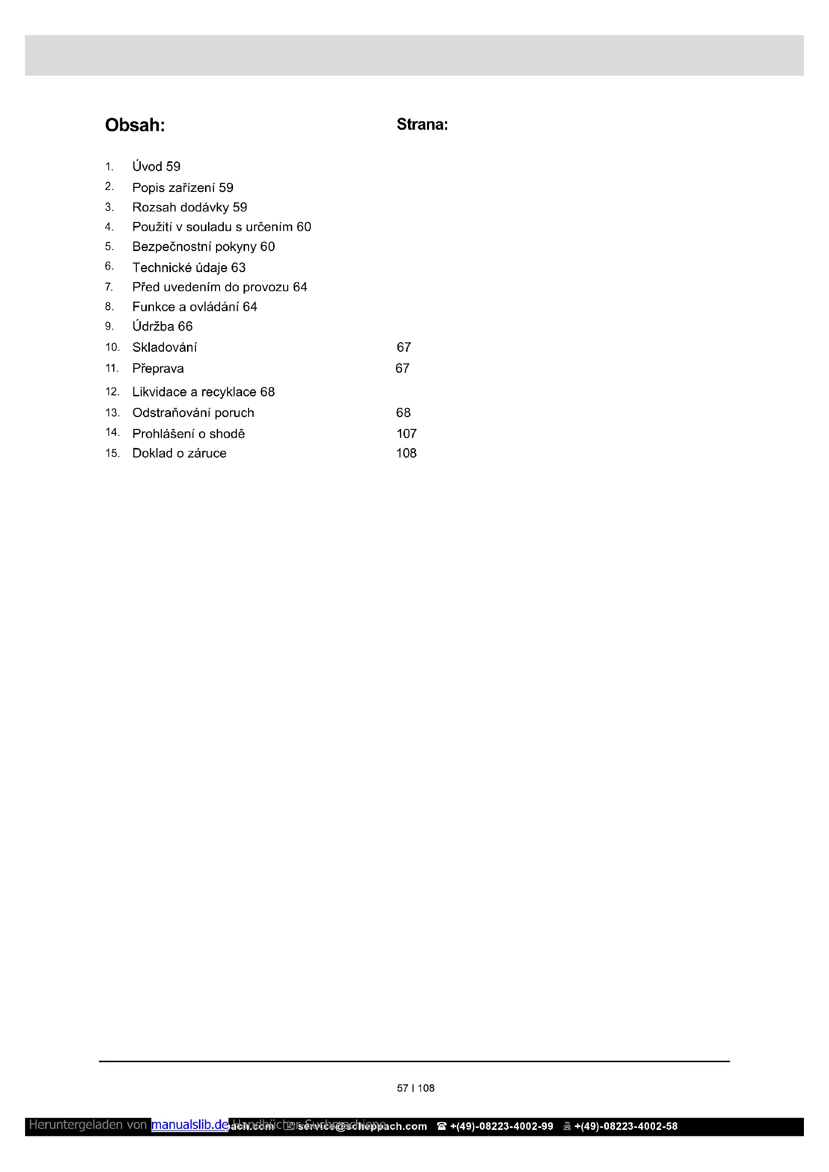 Místa, která se týkají bezpečnosti, jsme v tomto návodu k použití označili touto značkou: m Kromě toho obsahuje provozní návod jiné důležité texty, které jsou označené slovem „POZOR!“. m Pozor! Při použití zařízení je nutné dodržovat jednotlivá bez- pečnostní opatření, aby se zabránilo zraněním a ško- dám. Pročtěte si proto pečlivě tento návod k obsluze / bezpečnostní pokyny. Pokud byste přístroj předali jiné osobě, přiložte k němu prosím i tento návod k obsluze / bezpečnostní pokyny. Nepřebíráme žádnou záruku za nehody nebo škody způsobené nedodržením tohoto ná- vodu a bezpečnostních pokynů. m NEBEZPEČÍ V případě nedodržení tohoto pokynu hrozí maximální ohrožení života, respektive nebezpečí smrtelných pora- nění. Heruntergeladen von manualslib.de Handbücher-Suchmachiene www.scheppach.com service@scheppach.com +(49)-08223-4002-99 +(49)-08223-4002-58 61 I 108