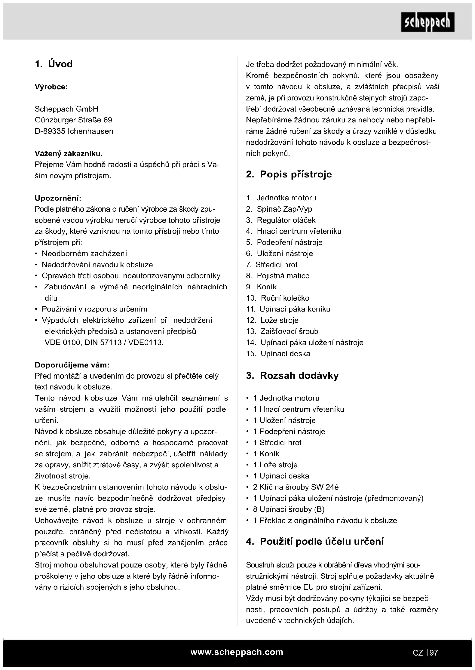 Výrobce: Scheppach GmbH Günzburger Straße 69 D-89335 Ichenhausen Vážený zákazníku, Přejeme Vám hodně radosti a úspěchů při práci s Va- ším novým přístrojem. Upozornění: Podle platného zákona o ručení výrobce za škody způ- sobené vadou výrobku neručí výrobce tohoto přístroje za škody, které vzniknou na tomto přístroji nebo tímto přístrojem při: