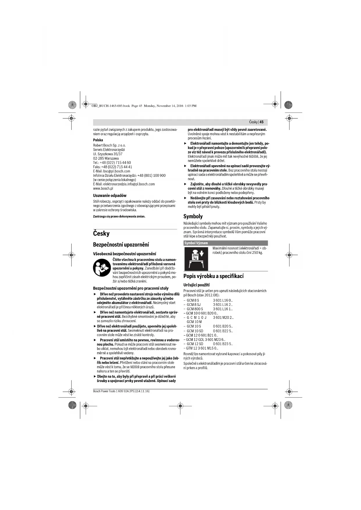 Nr Określenie Ilość Numer katalogowy Zestaw montażowy 2 610 948 662 Blat stołu 1 619 PA2 498 OBJ_BUCH-1463-003.book Page 44 Monday, November 14, 2016 1:03 PMČesky | 45 Bosch Power Tools 1 609 92A 2P5 | (14.11.16) razie pytań związanych z zakupem produktu, jego zastosowa- niem oraz regulacją urządzeń i osprzętu. Polska Robert Bosch Sp. z o.o. Serwis Elektronarzędzi Ul. Szyszkowa 35/37 02-285 Warszawa Tel.: +48 (022) 715 44 60 Faks: +48 (022) 715 44 41 E-Mail: bsc@pl.bosch.com Infolinia Działu Elektronarzędzi: +48 (801) 100 900 (w cenie połączenia lokalnego) E-Mail: elektronarzedzia.info@pl.bosch.com www.bosch.pl Usuwanie odpadów Stół roboczy, osprzęt i opakowanie należy oddać do powtór- nego przetworzenia zgodnego z obowiązującymi przepisami w zakresie ochrony środowiska. Zastrzega się prawo dokonywania zmian. Česky Bezpečnostní upozornění Všeobecná bezpečnostní upozornění Čtěte všechna k pracovnímu stolu a namon- tovanému elektronářadí přiložená varovná upozornění a pokyny. Zanedbání při dodržo- vání bezpečnostních upozornění a pokynů mo- hou zapříčinit zásah elektrickým proudem, po- žár a/nebo těžká zranění. Bezpečnostní upozornění pro pracovní stoly Dříve než provedete nastavení stroje nebo výměnu dílů příslušenství, vytáhněte zástrčku ze zásuvky a/nebo odejměte akumulátor z elektronářadí. Neúmyslný start elektronářadí je příčinou některých úrazů. Dříve než namontujete elektronářadí, sestavte správ- ně pracovní stůl. Bezchybné smontování je důležité, aby se zamezilo riziku zhroucení. Dříve než elektronářadí použijete, upevněte jej spoleh- livě na pracovní stůl. Sesmeknutí elektronářadí na pra- covním stole může vést ke ztrátě kontroly. Pracovní stůl umístěte na pevnou, rovinnou a vodorov- nou plochu. Pokud se může pracovní stůl sesmeknout ne- bo viklat, nemohou být elektronářadí nebo obrobek rovno- měrně a spolehlivě vedeny. Pracovní stůl nepřetěžujte a nepoužívejte jej jako žeb- řík nebo lešení. Přetížení nebo stání na pracovním stole může vést k tomu, že se těžiště pracovního stolu přesune nahoru a ten se převrátí. Dbejte na to, aby byly při přepravě a při práci veškeré šrouby a spojovací prvky pevně utažené. Upínací sady pro elektronářadí musejí být vždy pevně zaaretované. Uvolněné spoje mohou vést k nestabilitám a nepřesným procesům řezání. Elektronářadí namontujte a demontujte jen tehdy, po- kud je v přepravní poloze (upozornění k přepravní polo- ze viz též návod k provozu příslušného elektronářadí). Elektronářadí jinak může mít tak nevýhodné těžiště, že jej nemůžete spolehlivě držet. Elektronářadí upevněné na upínací sadě provozujte vý- hradně na pracovním stole. Bez pracovního stolu nestojí upínací sada s elektronářadím spolehlivě a může se převrh- nout. Zajistěte, aby dlouhé a těžké obrobky nevyvedly pra- covní stůl z rovnováhy. Dlouhé a těžké obrobky musejí být na volném konci podloženy nebo podepřeny. Nedávejte při zasouvání nebo roztahování pracovního stolu své prsty do blízkosti kloubových bodů. Prsty by mohly být přiskřípnuty. Symboly Následující symboly mohou mít význam pro používání Vašeho pracovního stolu. Zapamatujte si, prosím, symboly a jejich vý- znam. Správná interpretace symbolů Vám pomůže pracovní stůl lépe a bezpečněji používat. Popis výrobku a specifikací Určující použití Pracovní stůl je určen pro upnutí následujících stacionárních pil Bosch (stav 2012.08): Rovněž lze namontovat vybrané kapovací a pokosové pily ji- ných výrobců. Společně s elektronářadím je pracovní stůl určen ke zkracová- ní prken a profilů. Symbol Význam Maximální nosnost (elektronářadí + ob- robek) pracovního stolu činí 250 kg. – GCM 8 S 3 601 L16 0.. – GCM 8 SJ 3 601 L16 2.. – GCM 800 S 3 601 L16 1.. – GCM 10 0 601 B20 0.. –GCM10J GCM 10 M 3 601 M20 2.. – GCM 10 S 0 601 B20 5.. – GCM 10 SD 0 601 B22 5.. – GCM 12 0 601 B21 0.. – GCM 12 GDL 3 601 M23 6.. – GCM 12 SD 0 601 B23 5.. – GTM 12 3 601 M15 0..