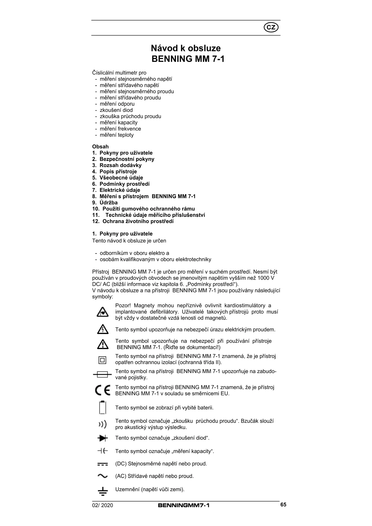 Tento návod k obsluze je určen - odborníkům v oboru elektro a - osobám kvalikovaným v oboru elektrotechniky Přístroj BENNING MM 7-1 je určen pro měření v suchém prostředí. Nesmí být používán v proudových obvodech se jmenovitým napětím vyšším než 1000 V DC/ AC (bližší informace viz kapitola 6. „Podmínky prostředí“). V návodu k obsluze a na přístroji BENNING MM 7-1 jsou používány následující symboly: Pozor! Magnety mohou nepříznivě ovlivnit kardiostimulátory a implantované defibrilátory. Uživatelé takových přístrojů proto musí být vždy v dostatečné vzdá lenosti od magnetů.