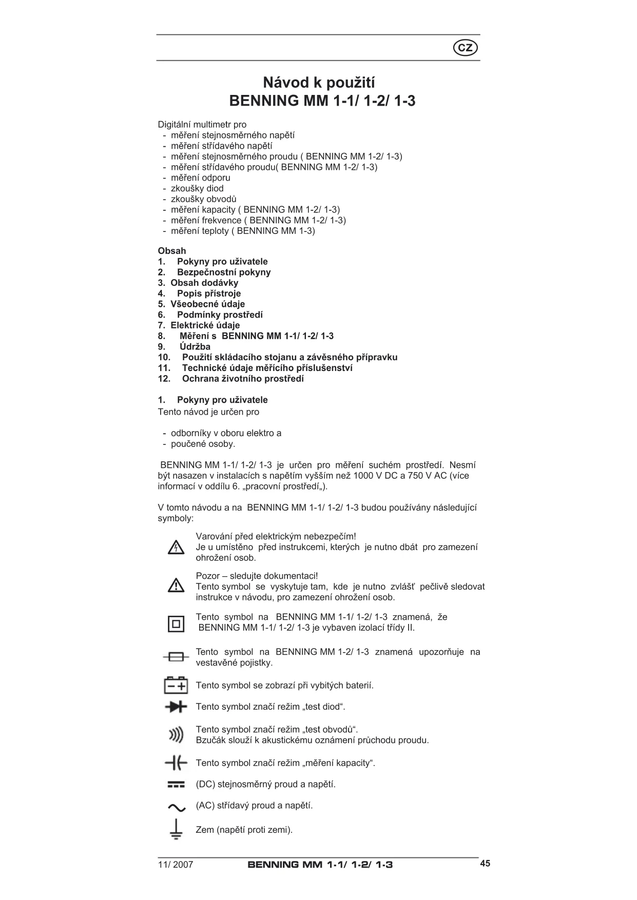 Návodkpoužití BENNING MM 1‑1/ 1‑2/ 1‑3 Digitální multimetr pro - měření stejnosměrného napětí - měření střídavého napětí - měření stejnosměrného proudu ( BENNING MM 1-2/ 1-3) - měření střídavého proudu( BENNING MM 1-2/ 1-3) - měření odporu - zkoušky diod - zkoušky obvodů - měření kapacity ( BENNING MM 1-2/ 1-3) - měření frekvence ( BENNING MM 1-2/ 1-3) - měření teploty ( BENNING MM 1-3) Obsah