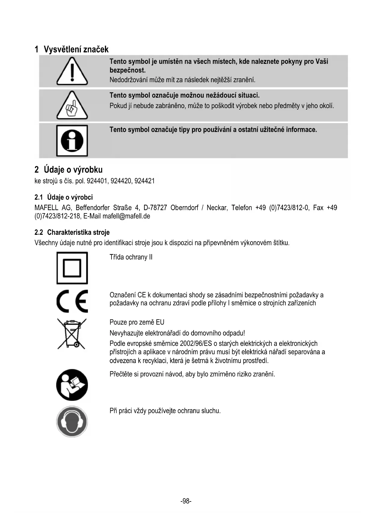 Tento symbol označuje tipy pro používání a ostatní užitečné informace. 2 Údaje o výrobku ke strojů s čís. pol. 924401, 924420, 924421
