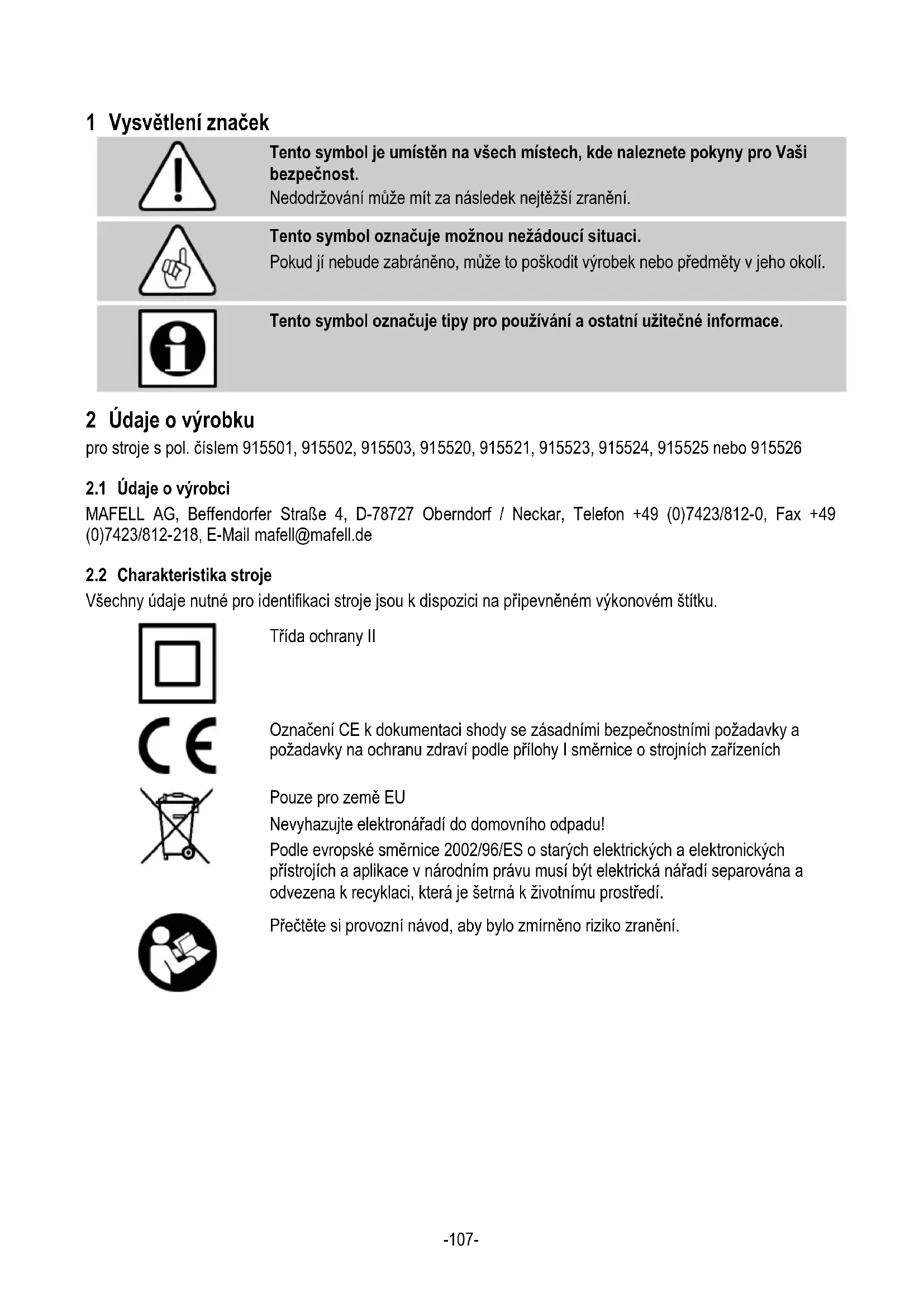 Tento symbol označuje tipy pro používání a ostatní užitečné informace. 2 Údaje o výrobku pro stroje s pol. číslem 915501, 915502, 915503, 915520, 915521, 915523, 915524, 915525 nebo 915526