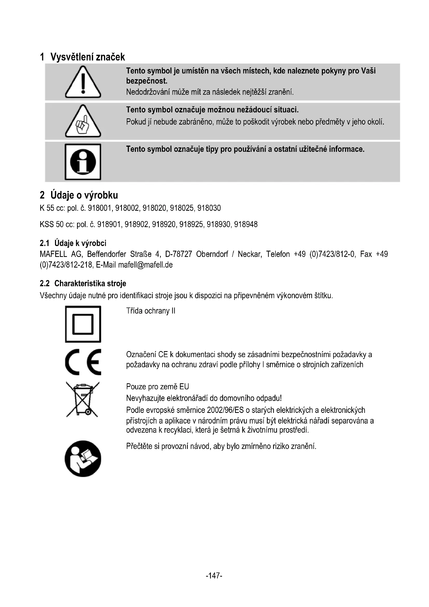 Tento symbol označuje tipy pro používání a ostatní užitečné informace. 2 Údaje o výrobku K 55 cc: pol. č. 918001, 918002, 918020, 918025, 918030 KSS 50 cc: pol. č. 918901, 918902, 918920, 918925, 918930, 918948