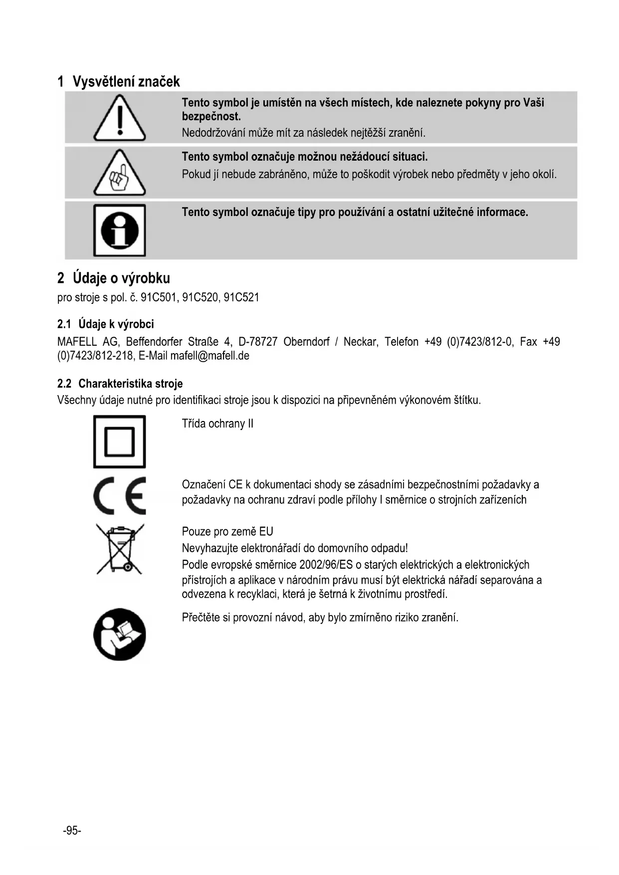 2 Údaje o výrobku pro stroje s pol. č. 91C501, 91C520, 91C521