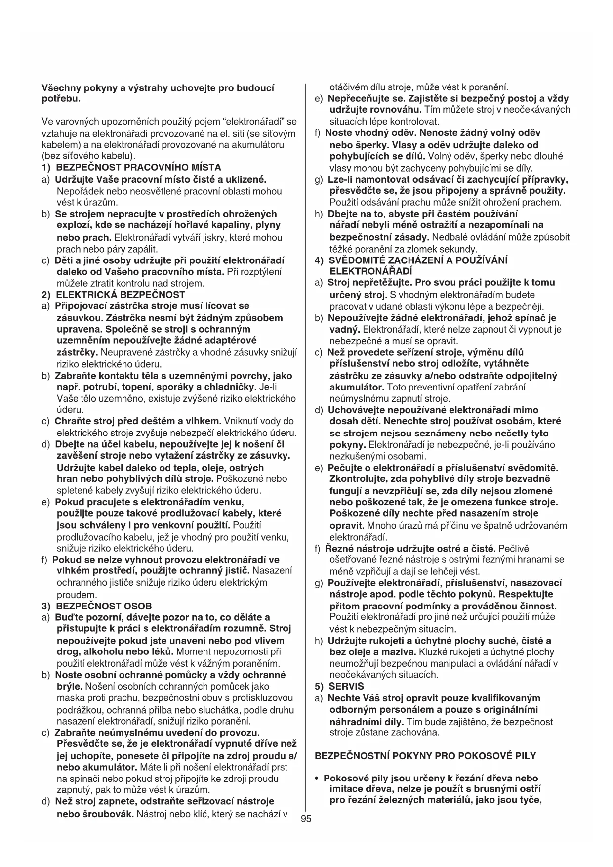 a) Buďte pozorní, dávejte pozor na to, co děláte a přistupujte k práci s elektronářadím rozumně. Stroj nepoužívejte pokud jste unaveni nebo pod vlivem drog, alkoholu nebo léků. Moment nepozornosti při použití elektronářadí může vést k vážným poraněním. b) Noste osobní ochranné pomůcky a vždy ochranné brýle. Nošení osobních ochranných pomůcek jako maska proti prachu, bezpečnostní obuv s protiskluzovou podrážkou, ochranná přilba nebo sluchátka, podle druhu nasazení elektronářadí, snižují riziko poranění. c) Zabraňte neúmyslnému uvedení do provozu. Přesvědčte se, že je elektronářadí vypnuté dříve než jej uchopíte, ponesete či připojíte na zdroj proudu a/ nebo akumulátor. Máte li při nošení elektronářadí prst na spínači nebo pokud stroj připojíte ke zdroji proudu zapnutý, pak to může vést k úrazům. d) Než stroj zapnete, odstraňte seřizovací nástroje nebo šroubovák. Nástroj nebo klíč, který se nachází v96 podepřené, mohou se převrhnout. Pokud se odříznutý kus nebo obrobek převrátí, může zvednout spodní kryt nebo být vymrštěn rotujícím ostřím.