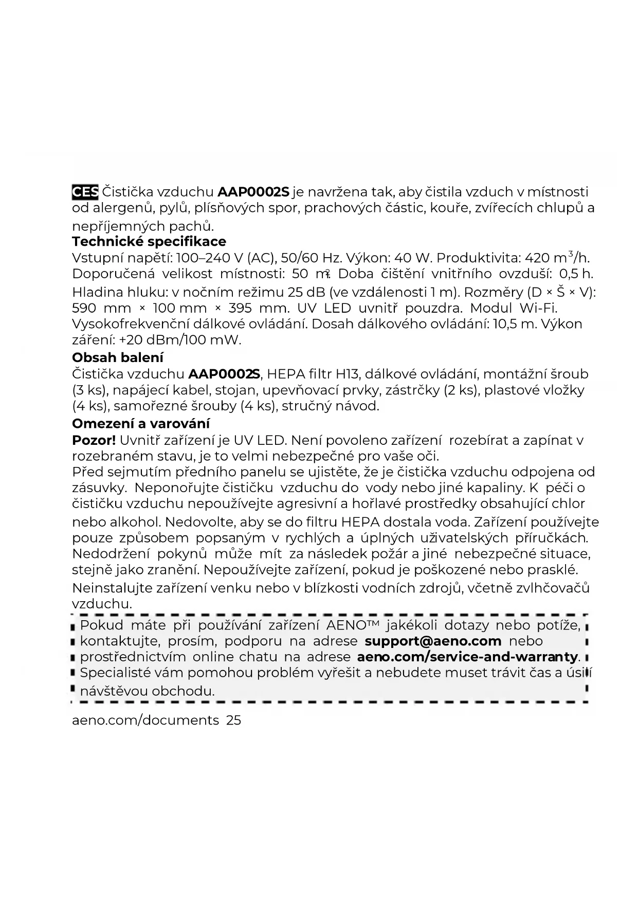 . Doba čištění vnitřního ovzduší: 0,5 h. Hladina hluku: v nočním režimu 25 dB (ve vzdálenosti 1 m). Rozměry (D × Š × V): 590 mm × 100 mm × 395 mm. UV LED uvnitř pouzdra. Modul Wi-Fi. Vysokofrekvenční dálkové ovládání. Dosah dálkového ovládání: 10,5 m. Výkon záření: +20 dBm/100 mW. Obsah balení Čistička vzduchu AAP0002S, HEPA filtr H13, dálkové ovládání, montážní šroub (3 ks), napájecí kabel, stojan, upevňovací prvky, zástrčky (2 ks), plastové vložky (4 ks), samořezné šrouby (4 ks), stručný návod. Omezení a varování Pozor! Uvnitř zařízení je UV LED. Není povoleno zařízení rozebírat a zapínat v rozebraném stavu, je to velmi nebezpečné pro vaše oči. Před sejmutím předního panelu se ujistěte, že je čistička vzduchu odpojena od zásuvky. Neponořujte čističku vzduchu do vody nebo jiné kapaliny. K péči o čističku vzduchu nepoužívejte agresivní a hořlavé prostředky obsahující chlor nebo alkohol. Nedovolte, aby se do filtru HEPA dostala voda. Zařízení používejte pouze způsobem popsaným v rychlých a úplných uživatelských příručkách. Nedodržení pokynů může mít za následek požár a jiné nebezpečné situace, stejně jako zranění. Nepoužívejte zařízení, pokud je poškozené nebo prasklé. Neinstalujte zařízení venku nebo v blízkosti vodních zdrojů, včetně zvlhčovačů vzduchu. Pokud máte při používání zařízení AENO™ jakékoli dotazy nebo potíže, kontaktujte, prosím, podporu na adrese support@aeno.com nebo prostřednictvím online chatu na adrese aeno.com/service-and-warranty. Specialisté vám pomohou problém vyřešit a nebudete muset trávit čas a úsilí návštěvou obchodu.26 aeno.com/documents Nevystavujte zařízení přímému slunečnímu záření, vlhkosti nebo vibracím. Neupusťte, neházejte, nerozebírejte zařízení a nepokoušejte se jej sami opravit. Nedávejte kabel vedle radiátorů, sporáků nebo ohřívačů. K čištění zařízení nepoužívejte čisticí prostředky. Nevhazujte zařízení do netříděného komunálního odpadu, mohlo by to poškodit životní prostředí. Další informace o správné likvidaci získáte u místní organizace pro sběr a likvidaci odpadu. Nedovolte dětem hrát si se zařízením. Hrozí nebezpečí vážného zranění a úrazu elektrickým proudem. Toto zařízení je určeno pouze pro dospělé. Varování, bezpečnostní opatření a pokyny obsažené v tomto dokumentu nemusí obsahovat všechny možné nebezpečné situace. Při používání zařízení používejte zdravý rozum. Zařízení na čištění vzduchu (viz obrázek a) (1) – přívod vzduchu, (2) – odnímatelný přední panel, (3) – HEPA filtr, (4) – plastové zátky, (5) – vyčištěný výstup vzduchu, (6) – kryt, (7) – instalační šrouby, (8) – stojan, (9) – držák pro montáž na zeď. Příprava zařízení k provozu (viz obrázek a) Před použitím odstraňte z filtru HEPA plastový obal. Nejprve se ujistěte, že je čistička vzduchu odpojena ze zásuvky. Poté opatrně sejměte přední panel (2), uchopte textilní závěsy a vytáhněte HEPA filtr (3) ven. Odstraňte z filtru plastovou fólii. Poté znovu vložte HEPA filtr (3) a zavřete přední panel (2). Pro čističku vzduchu jsou k dispozici dvě možnosti instalace: na stojanu: Zasuňte zástrčky (4) do otevřených konců stojanu (8). Připevněte stojan třemi stavěcími šrouby (7) k tělesu čističe vzduchu (6). na stěně: Připevněte upevňovací prvek (9) na zvolené místo na stěně (nejméně 170 cm od podlahy). Zašroubujte tři stavěcí šrouby (6) do zadního panelu tělesa čističe vzduchu (7). Vložte hlavy stavěcích šroubů (7) na zadní straně čističe vzduchu do drážek držáku (9) již připevněného ke stěně. Ovládání z ovládacího panelu (viz obrázek b) Indikátor kvality vnitřního ovzduší/časový displej udává buď kvalitu vnitřního vzduchu, nebo dobu provozu čističky vzduchu před vypnutímaeno.com/documents 27 časovače. Indikátor signalizuje, že dochází k ultrafialovému čištění vnitřního vzduchu. Tlačítko rychlosti umožňuje měnit rychlost ventilátorů čističe vzduchu, která je indikována ukazatelem rychlosti vzduchu, při každém dalším stisknutí. Tlačítko “Start/Stop” umožňuje zapnout a vypnout čističku vzduchu. Tlačítko “Hibernace” přepne čističku vzduchu do režimu spánku s minimálním výkonem ventilátoru, kdy se vypnou všechny indikátory kromě tlačítka spánku. Tento režim ukončíte opětovným stisknutím tlačítka. Tlačítko automatického režimu na základě vyhodnocení kvality vzduchu v místnosti spustí jeden ze tří vhodných provozních režimů čističky vzduchu. Tlačítko Wi-Fi aktivuje zařízení Wi-Fi čističky vzduchu a umožňuje ji ovládat na dálku pomocí chytrého telefonu. Více informací najdete v návodu k připojení čističky vzduchu k aplikaci “AENO”, který je k dispozici na adrese aeno.com/documents. Indikátor mění svou barvu v závislosti na míře znečištění ovzduší organickými sloučeninami (lepidla, barvy, laky, rozpouštědla atd.). Tlačítko časovače přepne indikátor kvality vzduchu do režimu časovače. Dalšími stisky nastavíte dobu chodu časovače: od 1 do 24 hodin. Tlačítko dětské pojistky se spustí po stisknutí na 3 sekundy. Všechna tlačítka jsou uzamčena. Přístup k nim obnovíte opětovným stisknutím a podržením ochranného tlačítka po dobu 3 sekund. Tlačítko ionizátoru obsahuje ionizátor, který odstraňuje nepříjemné pachy. Tlačítko pro resetování filtru znamená, že je čas vyměnit filtr HEPA. Stiskněte a podržte tlačítko po dobu 10 sekund, aby přestalo blikat. Odpočítávání do konce provozu HEPA filtru čističky vzduchu začne od nuly. Ovládání čističky vzduchu pomocí dálkového ovlad
