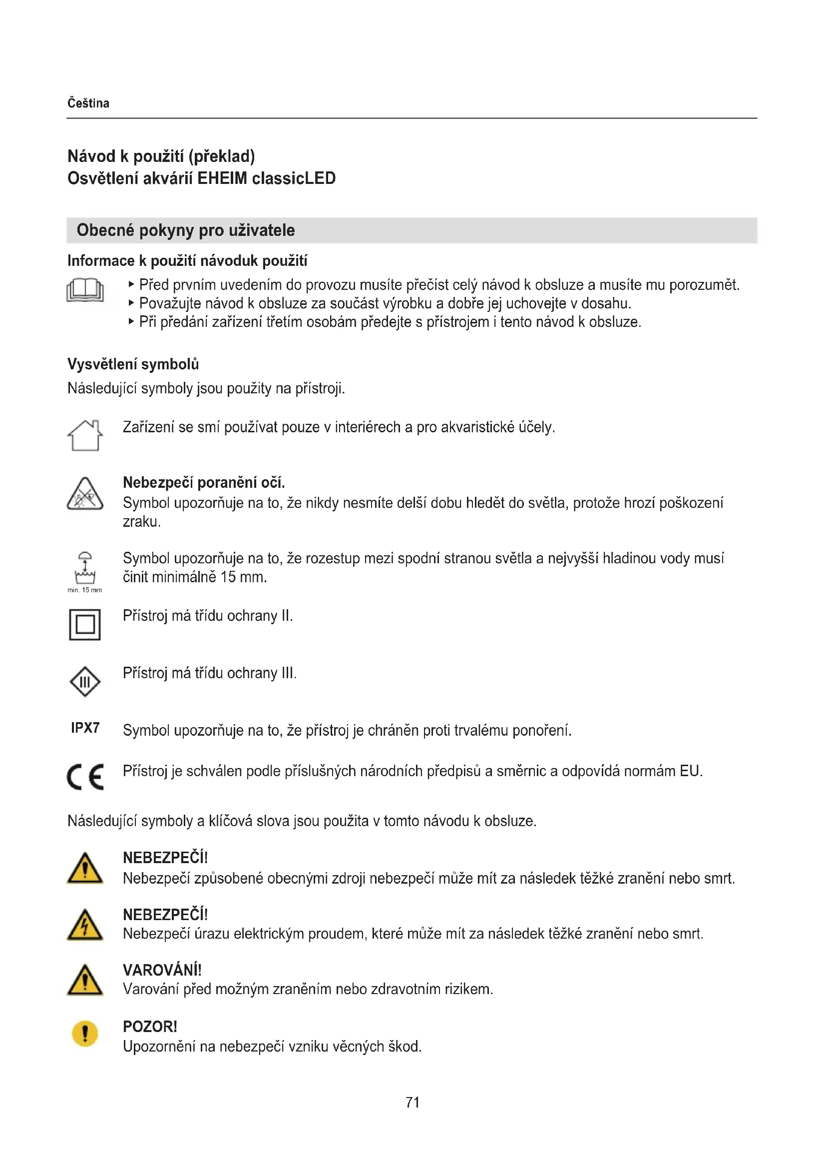 Dane techniczne Patrz strona 120.70 Polski Części zamienne Patrz strona 3. Zakończenie użytkowania i utylizacja Utylizacja Podczas utylizacji urządzenia należy przestrzegać obowiązujących przepisów prawnych. Informacja dotycząca utylizacji urządzeń elektrycznych i elektronicznych we Wspólnocie Europej- skiej: Na terenie Wspólnoty Europejskiej obowiązują przepisy krajowe dotyczące utylizacji urządzeń zasilanych elektrycznie, które oparte są na dyrektywie UE 2012/19/WE w sprawie zużytego sprzętu elektrycznego i elektronicznego (WEEE). Zgodnie z nimi niniejszego urządzenia nie wolno wyrzucać do odpadów komunalnych ani domowych. Urządzenie jest bezpłatnie odbierane w komunalnych punktach zbiórki lub przez zakłady utylizacji odpadów. Opakowanie produktu składa się z materiałów, które można poddać recyklingowi. Materiały te należy zutylizować w ekologiczny sposób i oddać do ponownego przetworzenia.71 Čeština Návod k použití (překlad) Osvětlení akvárií EHEIM classicLED Obecné pokyny pro uživatele Informace k použití návoduk použití ▶ Před prvním uvedením do provozu musíte přečíst celý návod k obsluze a musíte mu porozumět. ▶ Považujte návod k obsluze za součást výrobku a dobře jej uchovejte v dosahu. ▶ Při předání zařízení třetím osobám předejte s přístrojem i tento návod k obsluze. Vysvětlení symbolů Následující symboly jsou použity na přístroji. Zařízení se smí používat pouze v interiérech a pro akvaristické účely. Nebezpečí poranění očí. Symbol upozorňuje na to, že nikdy nesmíte delší dobu hledět do světla, protože hrozí poškození zraku. Symbol upozorňuje na to, že rozestup mezi spodní stranou světla a nejvyšší hladinou vody musí činit minimálně 15 mm. Přístroj má třídu ochrany II. Přístroj má třídu ochrany III. Symbol upozorňuje na to, že přístroj je chráněn proti trvalému ponoření. Přístroj je schválen podle příslušných národních předpisů a směrnic a odpovídá normám EU. Následující symboly a klíčová slova jsou použita v tomto návodu k obsluze. NEBEZPEČÍ! Nebezpečí způsobené obecnými zdroji nebezpečí může mít za následek těžké zranění nebo smrt. NEBEZPEČÍ! Nebezpečí úrazu elektrickým proudem, které může mít za následek těžké zranění nebo smrt. VAROVÁNÍ! Varování před možným zraněním nebo zdravotním rizikem. POZOR! Upozornění na nebezpečí vzniku věcných škod. min. 15 mm IPX772 Čeština Oblast použití Přístroj a všechny části, které jsou součástí dodání, jsou určeny pro soukromé využití a smí se používat výhradně: ‧ k osvětlování akvárií ‧ při dodržení technických údajů Pokyn s užitečnými informacemi a tipy. Konvence zobrazení: Odkaz na vyobrazení, zde odkaz na vyobrazení A. Výzva k provedení činnosti.