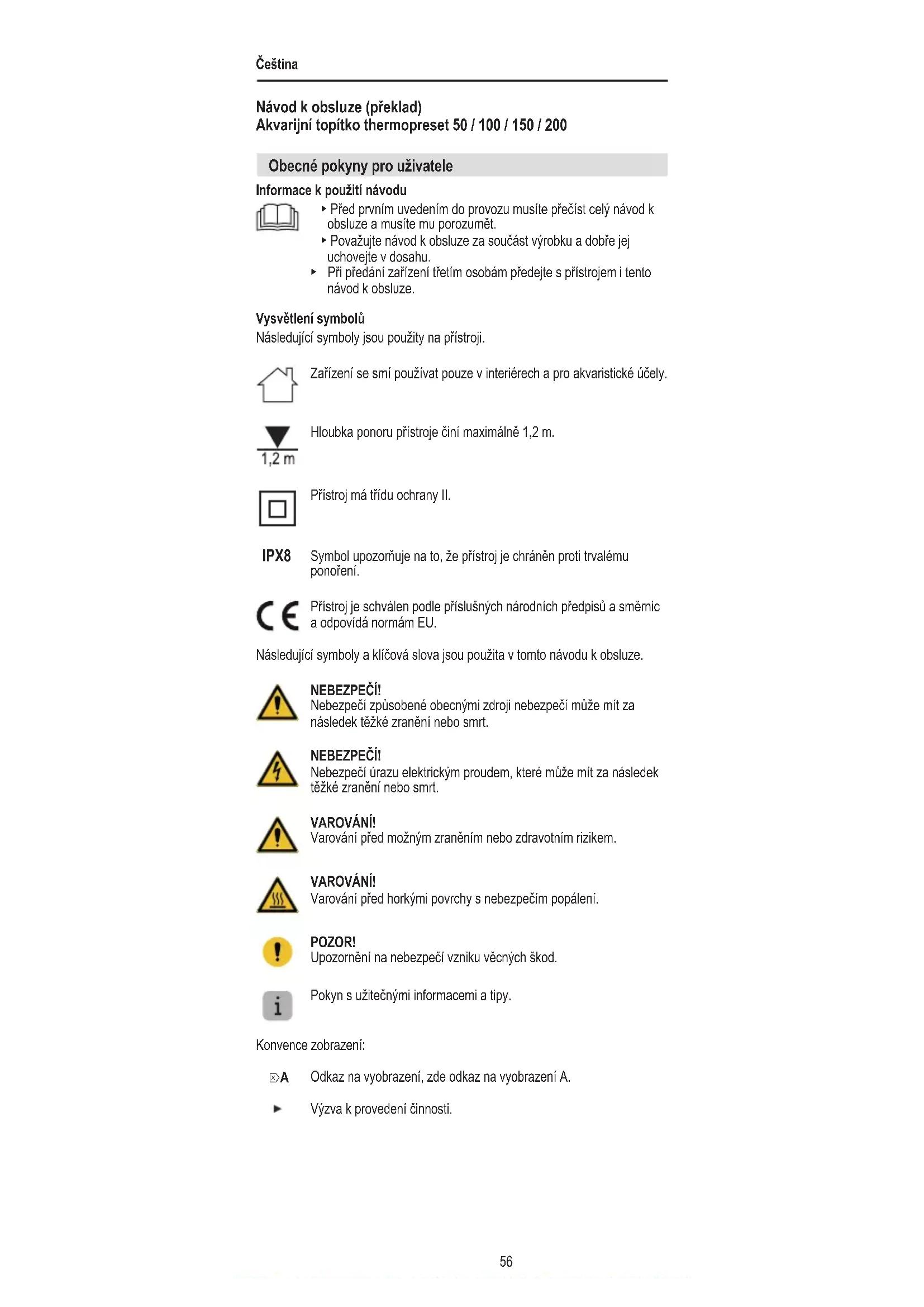 Návod k obsluze (překlad) Akvarijní topítko thermopreset 50 / 100 / 150 / 200 Obecné pokyny pro uživatele Informace k použití návodu ▶ Před prvním uvedením do provozu musíte přečíst celý návod k obsluze a musíte mu porozumět. ▶ Považujte návod k obsluze za součást výrobku a dobře jej uchovejte v dosahu. ▶ Při předání zařízení třetím osobám předejte s přístrojem i tento návod k obsluze. Vysvětlení symbolů Následující symboly jsou použity na přístroji. Zařízení se smí používat pouze v interiérech a pro akvaristické účely. Hloubka ponoru přístroje činí maximálně 1,2 m. Přístroj má třídu ochrany II. IPX8 Symbol upozorňuje na to, že přístroj je chráněn proti trvalému ponoření. Přístroj je schválen podle příslušných národních předpisů a směrnic a odpovídá normám EU. Následující symboly a klíčová slova jsou použita v tomto návodu k obsluze. NEBEZPEČÍ! Nebezpečí způsobené obecnými zdroji nebezpečí může mít za následek těžké zranění nebo smrt. NEBEZPEČÍ! Nebezpečí úrazu elektrickým proudem, které může mít za následek těžké zranění nebo smrt. VAROVÁNÍ! Varování před možným zraněním nebo zdravotním rizikem. VAROVÁNÍ! Varování před horkými povrchy s nebezpečím popálení. POZOR! Upozornění na nebezpečí vzniku věcných škod. Pokyn s užitečnými informacemi a tipy. Konvence zobrazení: Odkaz na vyobrazení, zde odkaz na vyobrazení A. Výzva k provedení činnosti. ⌦AČeština