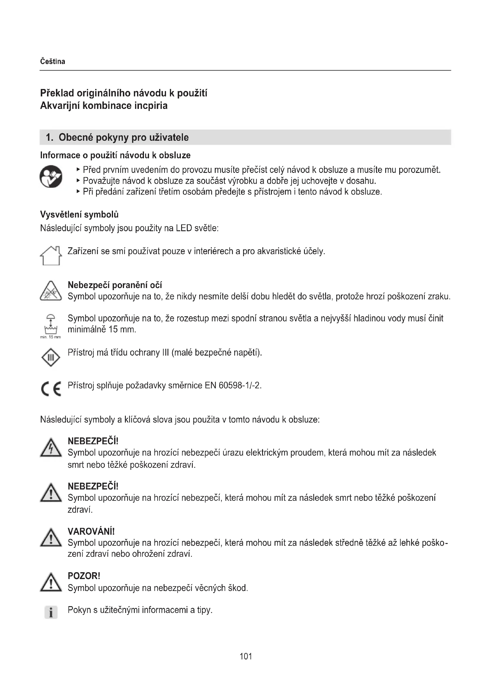 Informace o použití návodu k obsluze ▶ Před prvním uvedením do provozu musíte přečíst celý návod k obsluze a musíte mu porozumět. ▶ Považujte návod k obsluze za součást výrobku a dobře jej uchovejte v dosahu. ▶ Při předání zařízení třetím osobám předejte s přístrojem i tento návod k obsluze. Vysvětlení symbolů Následující symboly jsou použity na LED světle: Zařízení se smí používat pouze v interiérech a pro akvaristické účely. Nebezpečí poranění očí Symbol upozorňuje na to, že nikdy nesmíte delší dobu hledět do světla, protože hrozí poškození zraku. Symbol upozorňuje na to, že rozestup mezi spodní stranou světla a nejvyšší hladinou vody musí činit minimálně 15 mm. Přístroj má třídu ochrany III (malé bezpečné napětí). Přístroj splňuje požadavky směrnice EN 60598-1/-2. Následující symboly a klíčová slova jsou použita v tomto návodu k obsluze: NEBEZPEČÍ! Symbol upozorňuje na hrozící nebezpečí úrazu elektrickým proudem, která mohou mít za následek smrt nebo těžké poškození zdraví. NEBEZPEČÍ! Symbol upozorňuje na hrozící nebezpečí, která mohou mít za následek smrt nebo těžké poškození zdraví. VAROVÁNÍ! Symbol upozorňuje na hrozící nebezpečí, která mohou mít za následek středně těžké až lehké poško
