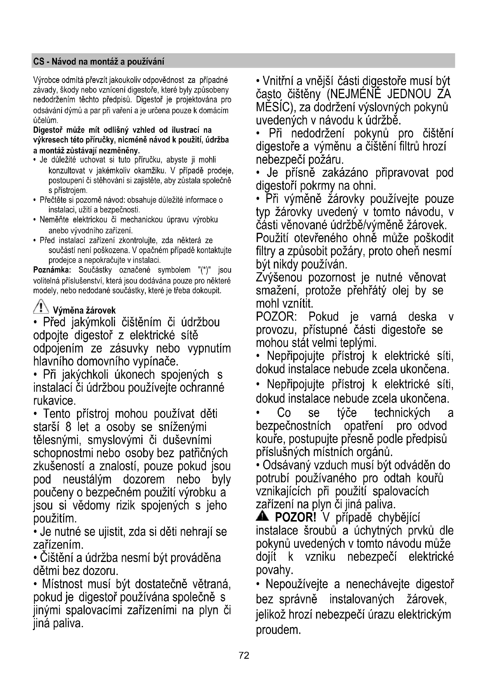 - Při výměně žárovky používejte pouze typ žárovky uvedený v tomto návodu, v části věnované údržbě/výměně žárovek. Použití otevřeného ohně může poškodit filtry a způsobit požáry, proto oheň nesmí být nikdy používán. Zvýšenou pozornost je nutné věnovat smažení, protože přehřátý olej by se mohl vznítit. POZOR: Pokud je varná deska v provozu, přístupné části digestoře se mohou stát velmi teplými.