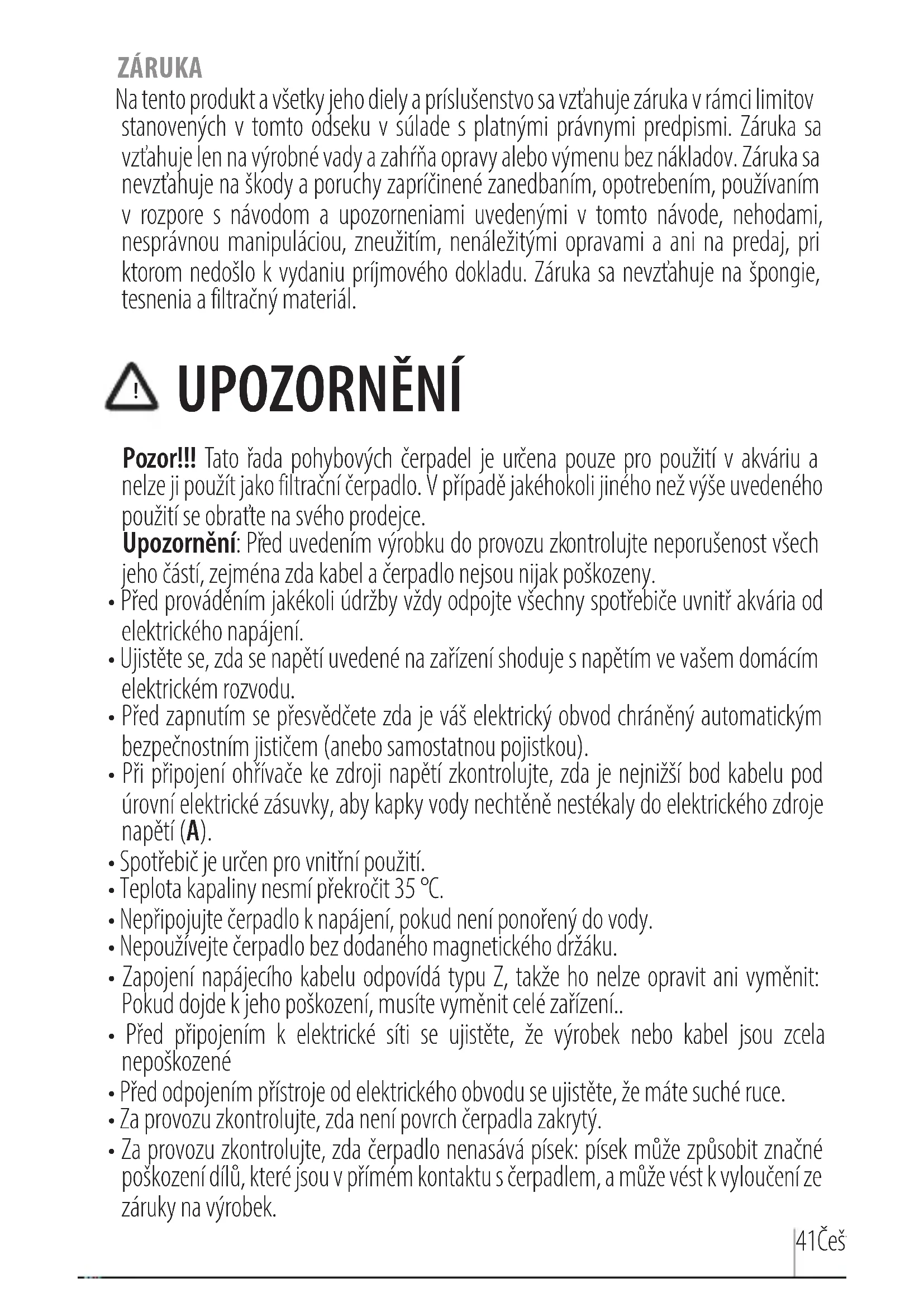 UPOZORNĚNÍ Pozor!!! Tato řada pohybových čerpadel je určena pouze pro použití v akváriu a nelze ji použít jako filtrační čerpadlo. V případě jakéhokoli jiného než výše uvedeného použití se obraťte na svého prodejce. Upozornění: Před uvedením výrobku do provozu zkontrolujte neporušenost všech jeho částí, zejména zda kabel a čerpadlo nejsou nijak poškozeny.