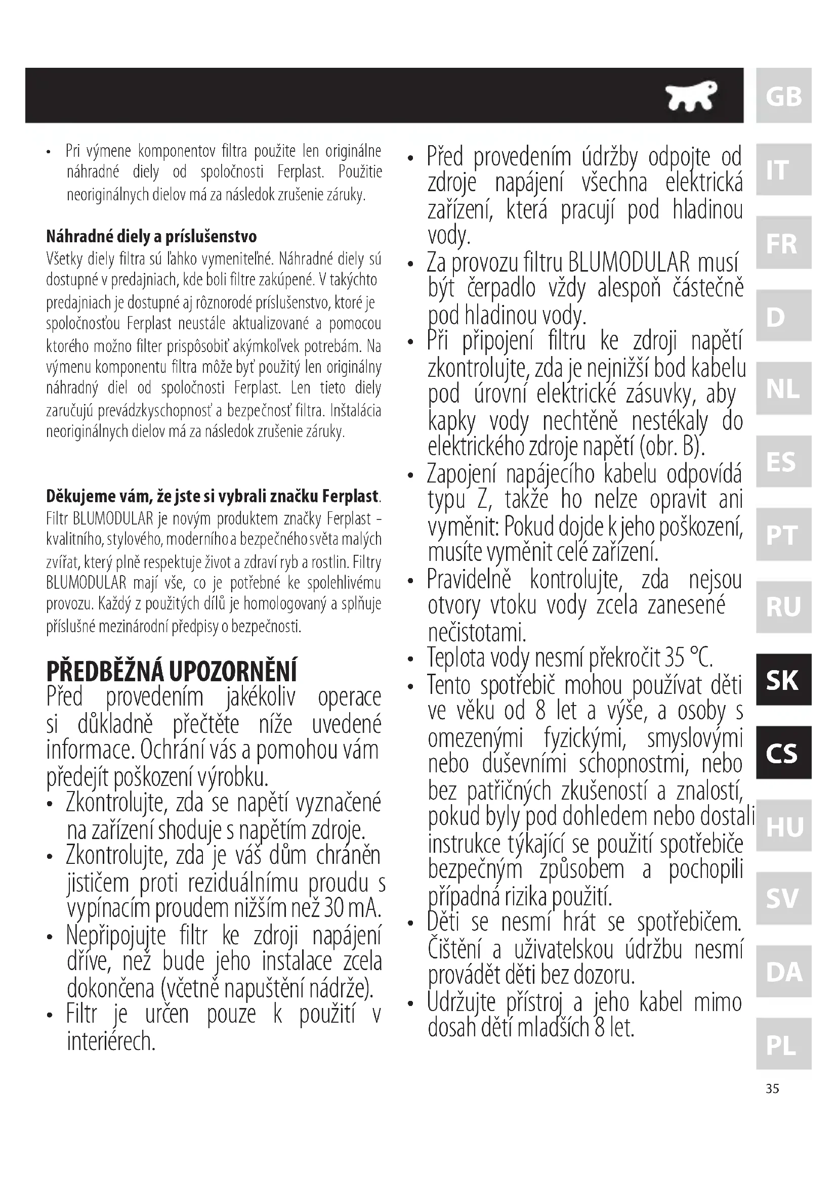 - Při výměně komponentů filtru použijte pouze originální náhradní díly společnosti Ferplast. Použití neoriginálních dílů má za následek zrušení záruky. Náhradní díly a příslušenství Všechny díly filtru lze snadno vyměnit. Náhradní díly jsou dostupné v prodejnách, ve kterých jste filtry koupili. V těchto prodejnách je k dostání i různé příslušenství, které je společnost Ferplast neustále aktualizuje, a pomocí kterého můžete filtr přizpůsobit jakýmkoliv potřebám. K výměně komponentu filtru můžete použít pouze originální náhradní díl společnosti Ferplast. Pouze tyto díly zaručují provozuschopnost a bezpečnost filtru. Instalace neoriginálních dílů má za následek zrušení záruky. Köszönjük, hogy a Ferplast márkát választotta. A BLUMODULAR a Ferplast cég új terméke - a kisállatok minőséges, stílusos, innovatív és biztonságos világának, amely teljes mértékben tiszteletben tartja a halak és növényzet életét és egészségét. A BLUMODULAR szűrőknek mindenük megvan, ami szükséges a megbízható üzemeltetéshez. Az összes felhasznált komponens homogenizált és megfelel a hozzávaló nemzetközi biztonsági előírásoknak.