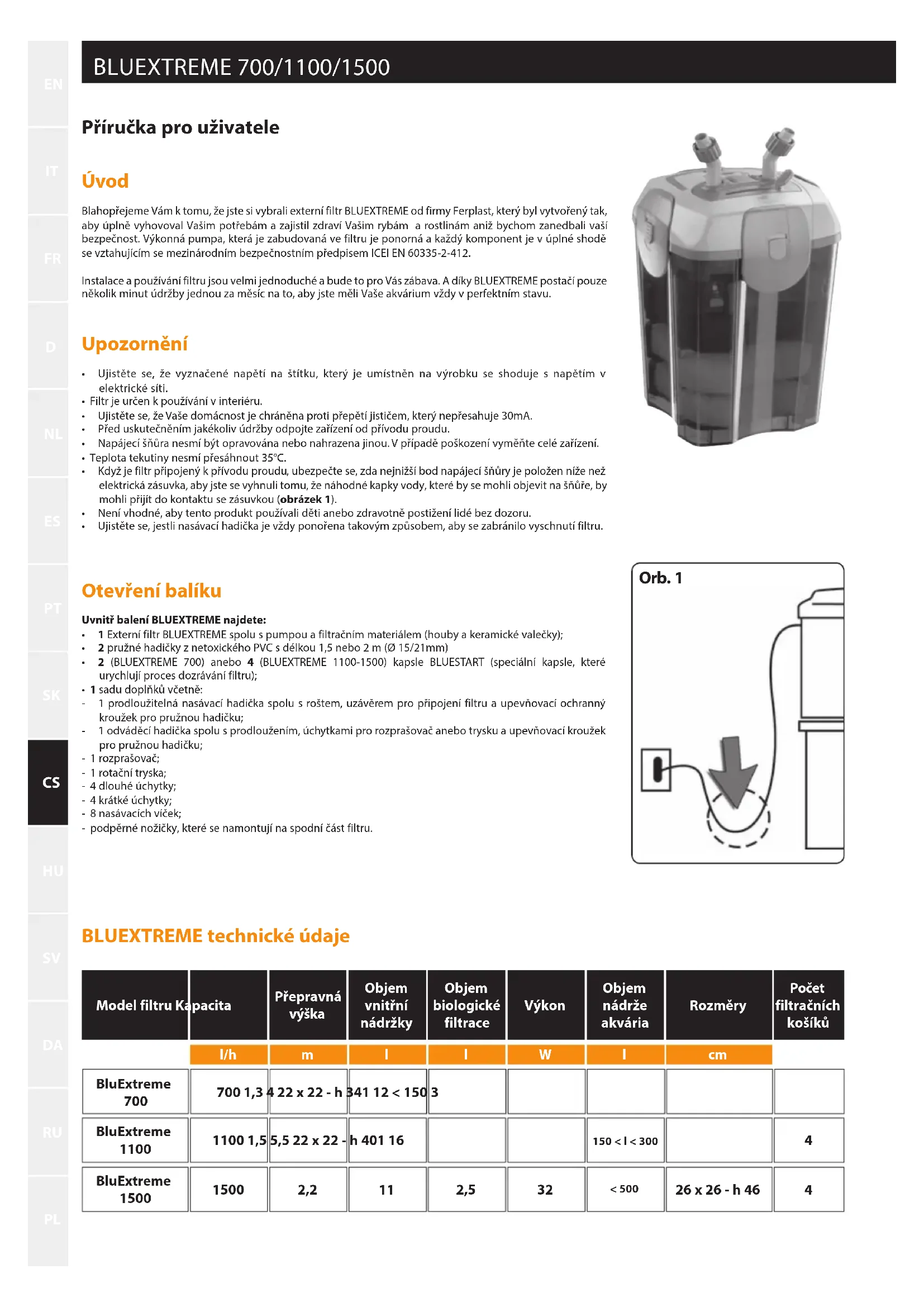 Příručka pro uživatele Úvod Blahopřejeme Vám k tomu, že jste si vybrali externí filtr BLUEXTREME od firmy Ferplast, který byl vytvořený tak, aby úplně vyhovoval Vašim potřebám a zajistil zdraví Vašim rybám a rostlinám aniž bychom zanedbali vaší bezpečnost. Výkonná pumpa, která je zabudovaná ve filtru je ponorná a každý komponent je v úplné shodě se vztahujícím se mezinárodním bezpečnostním předpisem ICEI EN 60335-2-412.Instalace a používání filtru jsou velmi jednoduché a bude to pro Vás zábava. A díky BLUEXTREME postačí pouze několik minut údržby jednou za měsíc na to, aby jste měli Vaše akvárium vždy v perfektním stavu. Upozornění