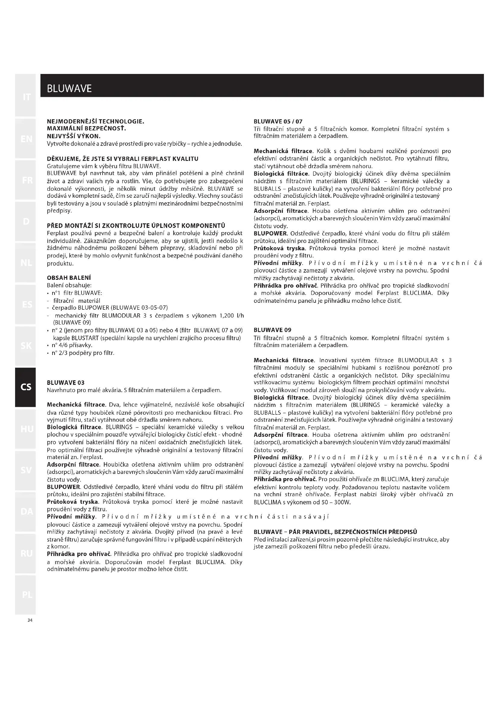 - n° 2/3 podpěry pro filtr. BLUWAVE 03 Navrhnuto pro malé akvária. S filtračním materiálem a čerpadlem. Mechanická filtrace. Dva, lehce vyjímatelné, nezávislé koše obsahující dva různé typy houbiček různé pórovitosti pro mechanickou filtraci. Pro vyjmutí filtru, stačí vytáhnout obě držadla směrem nahoru. Biologická filtrace. BLURINGS – speciální keramické válečky s velkou plochou v speciálním pouzdře vytvářející biologicky čistící efekt - vhodné pro vytvoření bakteriální flóry na ničení oxidačních znečisťujícich látek. Pro optimální filtraci používejte výhradně originální a testovaný filtrační materiál zn. Ferplast. Adsorpční filtrace. Houbička ošetřena aktivním uhlím pro odstranění (adsorpci), aromatických a barevných sloučenin Vám vždy zaručí maximální čistotu vody. BLUPOWER. Odstředivé čerpadlo, které vhání vodu do filtru při stálém průtoku, ideální pro zajistění stabilní filtrace. Průtoková tryska. Průtoková tryska pomocí které je možné nastavit proudění vody z filtru. Přívodní mřížky. Přívodní mřížky umístěné na vrchní části nasávají plovoucí částice a zamezují vytváření olejové vrstvy na povrchu. Spodní mřížky zachytávají nečistoty z akvária. Dvojitý přívod (na pravé a levé straně filtru) zaručuje správné fungování filtru i v případě ucpání některých z komor. Přihrádka pro ohřívač. Přihrádka pro ohřívač pro tropické sladkovodní a mořské akvária. Doporučován model Ferplast BLUCLIMA. Díky odnímatelnému panelu je prostor možno lehce čistit. BLUWAVE 05 / 07 Tři filtrační stupně a 5 filtračních komor. Kompletní filtrační systém s filtračním materiálem a čerpadlem. Mechanická filtrace. Košík s dvěmi houbami rozličné poréznosti pro efektivní odstranění částic a organických nečistot. Pro vytáhnutí filtru, stačí vytáhnout obě držadla směrem nahoru. Biologická filtráce. Dvojitý biologický účinek díky dvěma speciálním nádržím s filtračním materiálem (BLURINGS – keramické válečky a BLUBALLS – plastové kuličky) na vytvoření bakteriální flóry potřebné pro odstranění znečisťujících látek. Používejte výhradně originální a testovaný filtrační materiál zn. Ferplast. Adsorpční filtrace. Houba ošetřena aktívním uhlím pro odstranění (adsorpci), aromatických a barevných sloučenin Vám vždy zaručí maximální čistotu vody. BLUPOWER. Odstředivé čerpadlo, které vhání vodu do filtru při stálém průtoku, ideální pro zajištění optimální filtrace. Průtoková tryska. Průtoková tryska pomocí které je možné nastavit proudění vody z filtru. Přívodní mřížky. Přívodní mřížky umístěné na vrchní částí nasávají plovoucí částice a zamezují vytváření olejové vrstvy na povrchu. Spodní mřížky zachytávají nečistoty z akvária. Přihrádka pro ohřívač. Přihrádka pro ohřívač pro tropické sladkovodní a mořské akvária. Doporučovaný model Ferplast BLUCLIMA. Díky odnímatelnému panelu je přihrádku možno lehce čistiť. BLUWAVE 09 Tři filtrační stupně a 5 filtračních komor. Kompletní filtrační systém s filtračním materiálem a čerpadlem. Mechanická filtrace. Inovativní systém filtrace BLUMODULAR s 3 filtračními moduly se speciálními hubkami s rozlišnou poréznotí pro efektivní odstranění částic a organických nečistot. Díky speciálnímu vstřikovacímu systému biologickým filtrem prochází optimální množství vody. Vstřikovací modul zároveň slouží na prokysličování vody v akváriu. Biologická filtrace. Dvojitý biologický účinek díky dvěma speciálním nádržím s filtračním materiálem (BLURINGS – keramické válečky a BLUBALLS – plastové kuličky) na vytvoření bakteriální flóry potřebné pro odstranění znečisťujícich látek. Používejte výhradně originální a testovaný filtrační materiál zn. Ferplast. Adsorpční filtrace. Houba ošetrena aktívním uhlím pro odstranění (adsorpci), aromatických a barevných sloučenin Vám vždy zaručí maximální čistotu vody. Přívodní mřížky. Přívodní mřížky umístěné na vrchní částí nasávají plovoucí částice a zamezují vytváření olejové vrstvy na povrchu. Spodní mřížky zachytávají nečistoty z akvária. Přihrádka pro ohřívač. Pro použití ohřívače zn BLUCLIMA, který zaručuje efektivní kontrolu teploty vody. Požadovanou teplotu nastavíte voličem na vrchní straně ohřívače. Ferplast nabízí široký výběr ohřívačů zn BLUCLIMA s výkonem od 50 – 300W. BLUWAVE – PÁR PRAVIDEL, BEZPEČNOSTNÍCH PŘEDPISŮ Před inštalací zařízení,si prosím pozorně přečtěte následující instrukce, aby jste zamezili poškození filtru nebo předešli úrazu. 363110-3_FI_BLUWAVE_nero.indd 34363110-3_FI_BLUWAVE_nero.indd 34 17/05/11 12.2517/05/11 12.2535