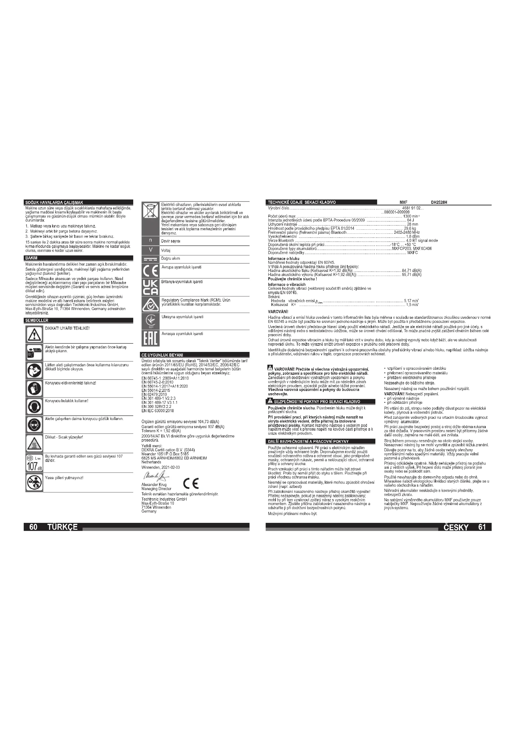 My jako výrobce výhradně na vlastní zodpovědnost prohlašujeme, že se výrobek popsaný v "Technických údajích" shoduje se všemi relevantními předpisy směrnice 2011/65/EÚ (RoHS), 2014/53/EU, 2006/42/ES a následujícími harmonizovanými normativními dokumenty: EN 60745-1 :2009+A11:2010 EN 60745-2-6:2010 EN 55014-1:2017+A11:2020 EN 55014-2:2015 EN 62479:2010 EN 301 489-1 V2.2.3 EN 301 489-17 V3.1.1 EN 300 328V2.2.2 EN IEC 63000:2018 Naměřená hladina akustického výkonu 104,73 dB(A) Zaručená hladina akustického výkonu 107 dB(A) Kolísavost K = 1,92 dB(A) Postup hodnocení shody podle 2000/14/ES, příloha VI. Notifi kovaná osoba: DEKRA Certifi cation B.V. (0344) Meander 1051/P.O.Box 5185