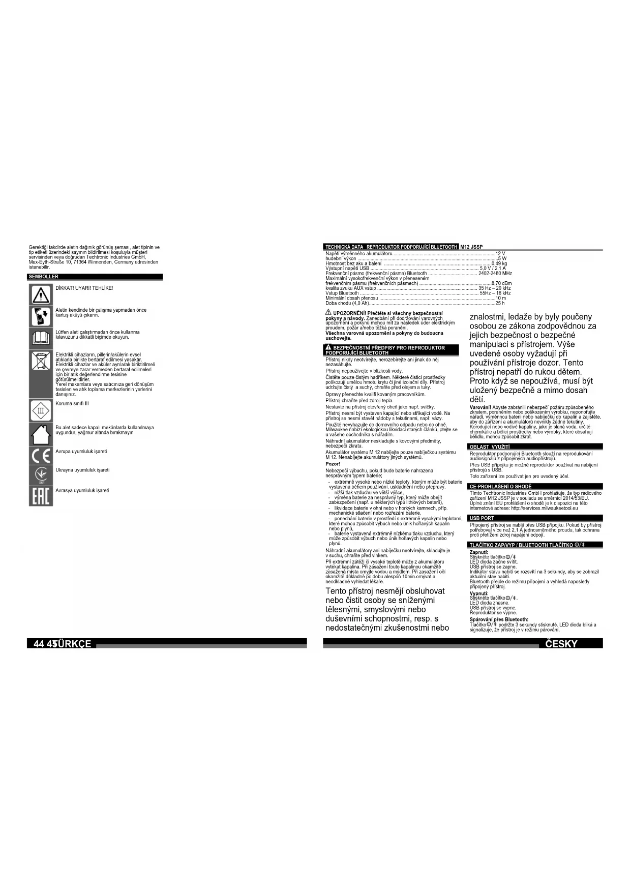 Napětí výměnného akumulátoru.................................................. hudební výkon ............................................................................. Hmotnost bez aku a balení ......................................................... Výstupní napětí USB ................................................................... Frekvenční pásmo (frekvenční pásma) Bluetooth ....................... Maximální vysokofrekvenční výkon v přeneseném frekvenčním pásmu (frekvenčních pásmech) .............................. kvalita zvuku AUX vstup .............................................................. Vstup Bluetooth ........................................................................... Minimální dosah přenosu ............................................................ Doba chodu (4,0 Ah).................................................................... UPOZORNĚNÍ! Přečtěte si všechny bezpečnostní pokyny a návody. Zanedbání při dodržování varovných upozornění a pokynů mohou mít za následek úder elektrickým proudem, požár a/nebo těžká poranění. Všechna varovná upozornění a pokyny do budoucna uschovejte.