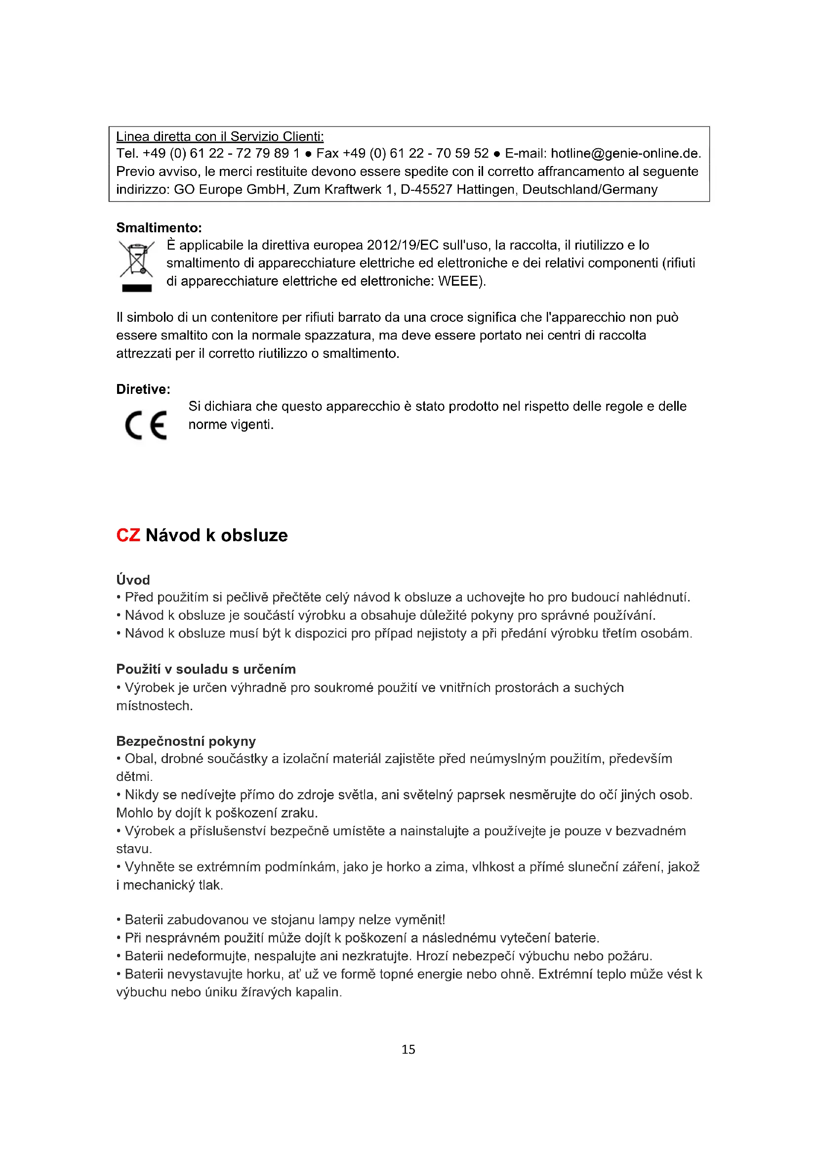 - Výrobek je určen výhradně pro soukromé použití ve vnitřních prostorách a suchých místnostech. Bezpečnostní pokyny