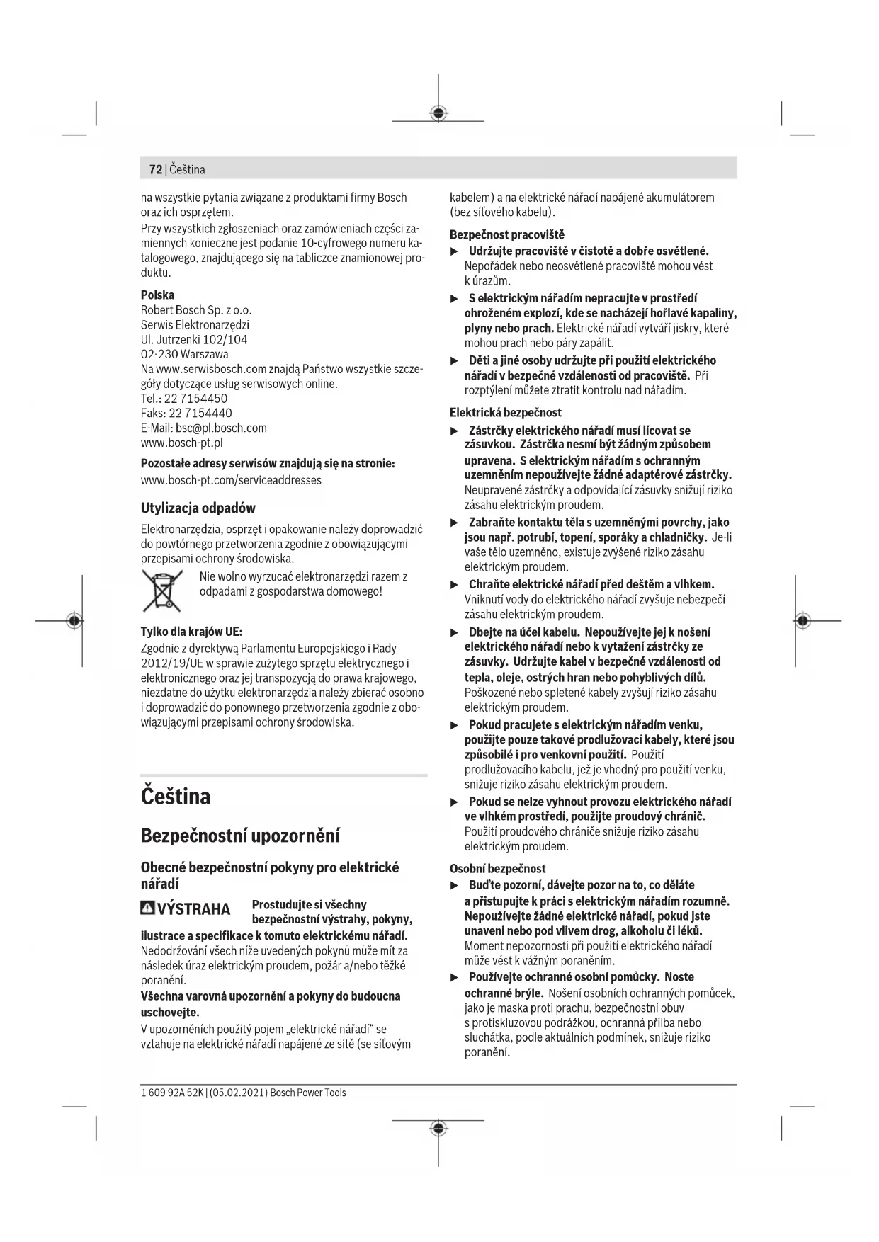 Úroveň vibrací aúroveň hluku, které jsou uvedené vtěchto pokynech, byly změřeny pomocí normované měřicí metody alze je použít pro vzájemné porovnání elektronářadí. Hodí se ipro předběžný odhad zatížení vibracemi ahlukem. Uvedená úroveň vibrací aúroveň hluku reprezentuje hlavní použití elektronářadí. Pokud se ovšem bude elektronářadí používat pro jiné práce, sjinými nástroji nebo snedostatečnou údržbou, může se úroveň hluku aúroveň vibrací lišit. To může zatížení vibracemi ahlukem po celou pracovní dobu zřetelně zvýšit. Pro přesný odhad zatížení vibracemi ahlukem by měly být zohledněny idoby, kdy je nářadí vypnuté nebo běží, ale ve skutečnosti se nepoužívá. To může zatížení vibracemi ahlukem po celou pracovní dobu výrazně snížit. Stanovte dodatečná bezpečnostní opatření kochraně obsluhy před účinky vibrací, jako je např. údržba elektronářadí anástrojů, udržování teplých rukou, organizace pracovních procesů. Montáž u Před každou prací na elektronářadí vytáhněte zástrčku ze zásuvky. Nasazení/výměna pilového plátku u Při montáži nebo výměně nástroje noste ochranné rukavice. Nástroje jsou ostré apři delším používání se mohou zahřívat. u Při výměně pilového listu dbejte na to, aby nebyly votvoru pro pilový list zbytky materiálu, např. dřevěné třísky či kovové piliny. u Dbejte na to, aby vupínání pilového listu nebyla zlomená stopka. Výběr pilového plátku Přehled doporučených pilových listů naleznete na konci tohoto návodu. Používejte pouze pilové listy s1/2" 1 609 92A 52K | (05.02.2021) Bosch Power ToolsČeština | 75 univerzální stopkou. Pilový list by neměl být delší, než je pro daný řez nutné. Tloušťka stopky pilového listu musí být0,8–1,8mm. Nasazení pilového listu (viz obrázek A) Stiskněte páčku SDS(9) dopředu anasaďte pilový list(1) za upínací destičkou do upínání pilového listu(3). Uvolněte páčku SDS(9). u Zkontrolujte řádné upevnění zatáhnutím za pilový list. Volný pilový list může vypadnout aporanit vás. Pro určité práce lze pilový list(1) také otočit o180° (zuby směřují nahoru) aznovu ho nasadit. Vyjmutí pilového listu (vizobrázekB) u Před vyjmutím nechte pilový list vychladnout. Při kontaktu shorkým pilovým listem hrozí nebezpečí poranění. Stiskněte páčku SDS(9) dopředu avytáhněte pilový list(1). Uvolněte páčku SDS(9). Odsávání prachu/třísek Prach zmateriálů, jako jsou nátěry sobsahem olova, některé druhy dřeva, minerály akov, může být zdraví škodlivý. Kontakt sprachem či vdechnutí mohou vyvolat alergické reakce a/nebo onemocnění dýchacích cest obsluhy nebo vblízkosti se nacházejících osob. Určitý prach, jako dubový nebo bukový prach, je pokládán za karcinogenní, zvláště ve spojení spřídavnými látkami pro ošetření dřeva (chromát, ochranné prostředky na dřevo). Materiál obsahující azbest smějí opracovávat pouze specialisté. – Zajistěte dobré větrání pracoviště. – Je doporučeno nosit ochrannou dýchací masku střídou filtruP2. Dodržujte předpisy pro obráběné materiály platné vpříslušné zemi. u Zabraňte hromadění prachu na pracovišti. Prach se může lehce vznítit. Provoz Uvedení do provozu u Dbejte na správné síťové napětí! Napětí zdroje proudu musí souhlasit súdaji na typovém štítku elektronářadí. Elektronářadí označené 230V smí být provozováno ina 220V. Zapnutí avypnutí Pro zapnutí elektronářadí stiskněte vypínač (6). Pro zaaretování vypínače (6) ho podržte stisknutý astiskněte ještě aretaci (5). Pro vypnutí elektronářadí uvolněte vypínač (6). Při zaaretovaném vypínači (6) nejprve vypínač stiskněte apak ho uvolněte. Regulace počtu zdvihů Počet zdvihů zapnutého elektronářadí můžete plynule regulovat tím, jak moc stisknete vypínač (6). Mírným stisknutím vypínače (6) dosáhnete nízkého počtu zdvihů. Se vzrůstajícím tlakem se počet zdvihů zvyšuje. Požadovaný počet zdvihů je závislý na materiálu apracovních podmínkách alze ho zjistit praktickou zkouškou. Snížení zdvihů se doporučuje při nasazování pilového plátku na obrobek apři řezání plastu ahliníku. Při delších pracích snízkým počtem zdvihů se může elektronářadí silně zahřát. Vyjměte pilový plátek anechte elektronářadí pro vychladnutí cca 3min běžet smaximálním počtem zdvihů. Pracovní pokyny u Před každou prací na elektronářadí vytáhněte zástrčku ze zásuvky. u Pokud se pilový plátek zablokuje, elektronářadí okamžitě vypněte. Tipy u Při řezání lehkých stavebních hmot dbejte zákonných ustanovení adoporučení výrobce materiálu. Před řezáním dřeva, dřevotřískových desek, stavebních materiálů atd. zkontrolujte, zda se vnich nenacházejí cizí tělesa, jako hřebíky, šrouby apod., apoužijte vhodný pilový list. Zapněte elektrické nářadí aveďte ho kobrobku. Nasaďte základní desku(2) na povrch obrobku ase stejnoměrným přítlakem, resp. posuvem materiál přeřízněte. Po ukončení práce elektrické nářadí vypněte. Pokud se pilový list vzpříčil, elektrické nářadí okamžitě vypněte. Řezanou spáru pomocí vhodného nástroje trochu rozepřete aelektrické nářadí vytáhněte ven. Pohyblivá základní deska (viz obrázekC) Základní deska(2) se díky své pohyblivosti přizpůsobí potřebnému úhlu povrchu. Ponorné řezání (viz obrázkyE–F) u Ponorné řezání se nesmí provádět uměkkých materiálů, jako je dřevo, sádrokarton apod.! Ponorné řezání nepoužívejte ukovových materiálů! Pro ponorné řezání použijte pouze krátké pilové listy. Nasaďte elektrické nářadí přední hranou základní desky (2) na obrobek tak, aby se pil