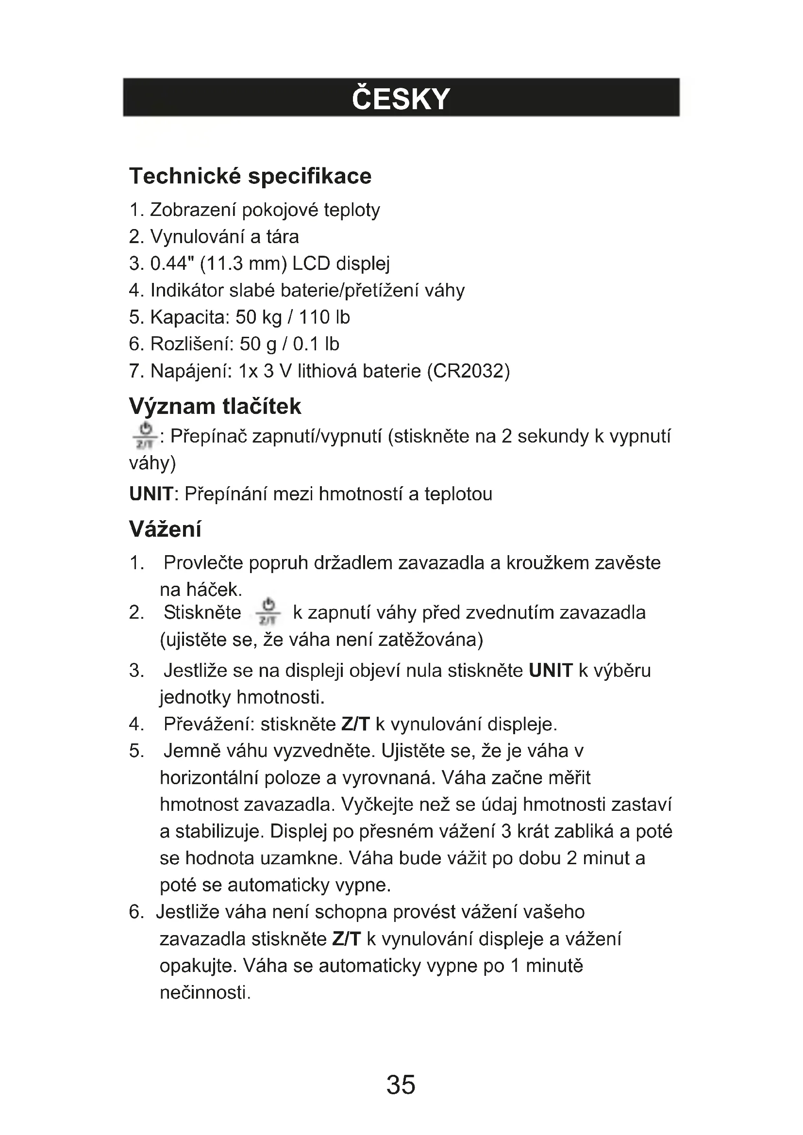 Význam tlaþítek : PĜepínaþ zapnutí/vypnutí (stisknČte na 2 sekundy k vypnutí váhy) UNIT: PĜepínání mezi hmotností a teplotou Vážení