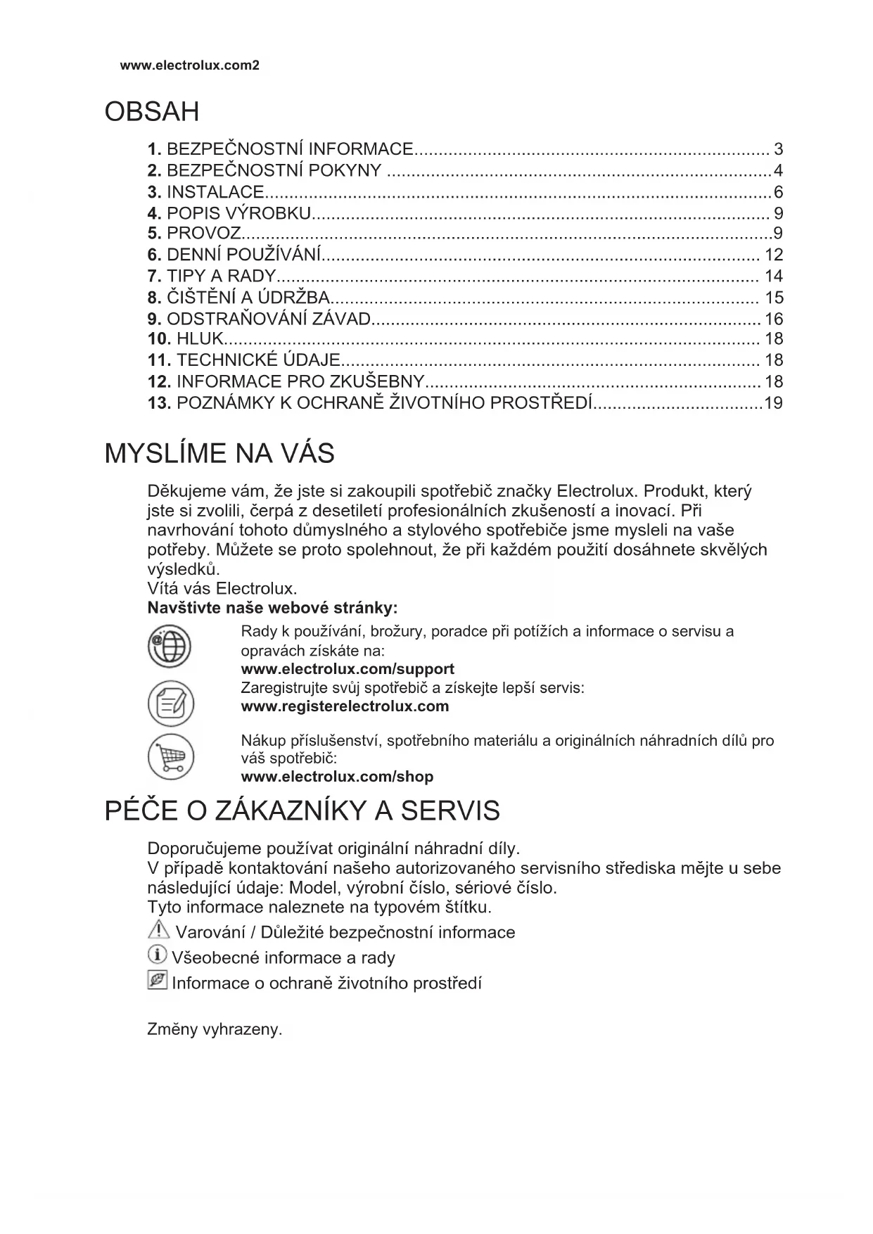 Děkujeme vám, že jste si zakoupili spotřebič značky Electrolux. Produkt, který jste si zvolili, čerpá z desetiletí profesionálních zkušeností a inovací. Při navrhování tohoto důmyslného a stylového spotřebiče jsme mysleli na vaše potřeby. Můžete se proto spolehnout, že při každém použití dosáhnete skvělých výsledků. Vítá vás Electrolux. Navštivte naše webové stránky: Rady k používání, brožury, poradce při potížích a informace o servisu a opravách získáte na: www.electrolux.com/support Zaregistrujte svůj spotřebič a získejte lepší servis: www.registerelectrolux.com Nákup příslušenství, spotřebního materiálu a originálních náhradních dílů pro váš spotřebič: www.electrolux.com/shop PÉČE O ZÁKAZNÍKY A SERVIS Doporučujeme používat originální náhradní díly. V případě kontaktování našeho autorizovaného servisního střediska mějte u sebe následující údaje: Model, výrobní číslo, sériové číslo. Tyto informace naleznete na typovém štítku. Varování / Důležité bezpečnostní informace Všeobecné informace a rady Informace o ochraně životního prostředí Zmĕny vyhrazeny. www.electrolux.com21. BEZPEČNOSTNÍ INFORMACE Tento návod si pečlivě přečtěte ještě před instalací spotřebiče a jeho prvním použitím. Výrobce nenese odpovědnost za žádný úraz ani škodu v důsledku nesprávné instalace nebo použití. Návod k použití vždy uchovávejte na bezpečném a přístupném místě pro jeho budoucí použití.