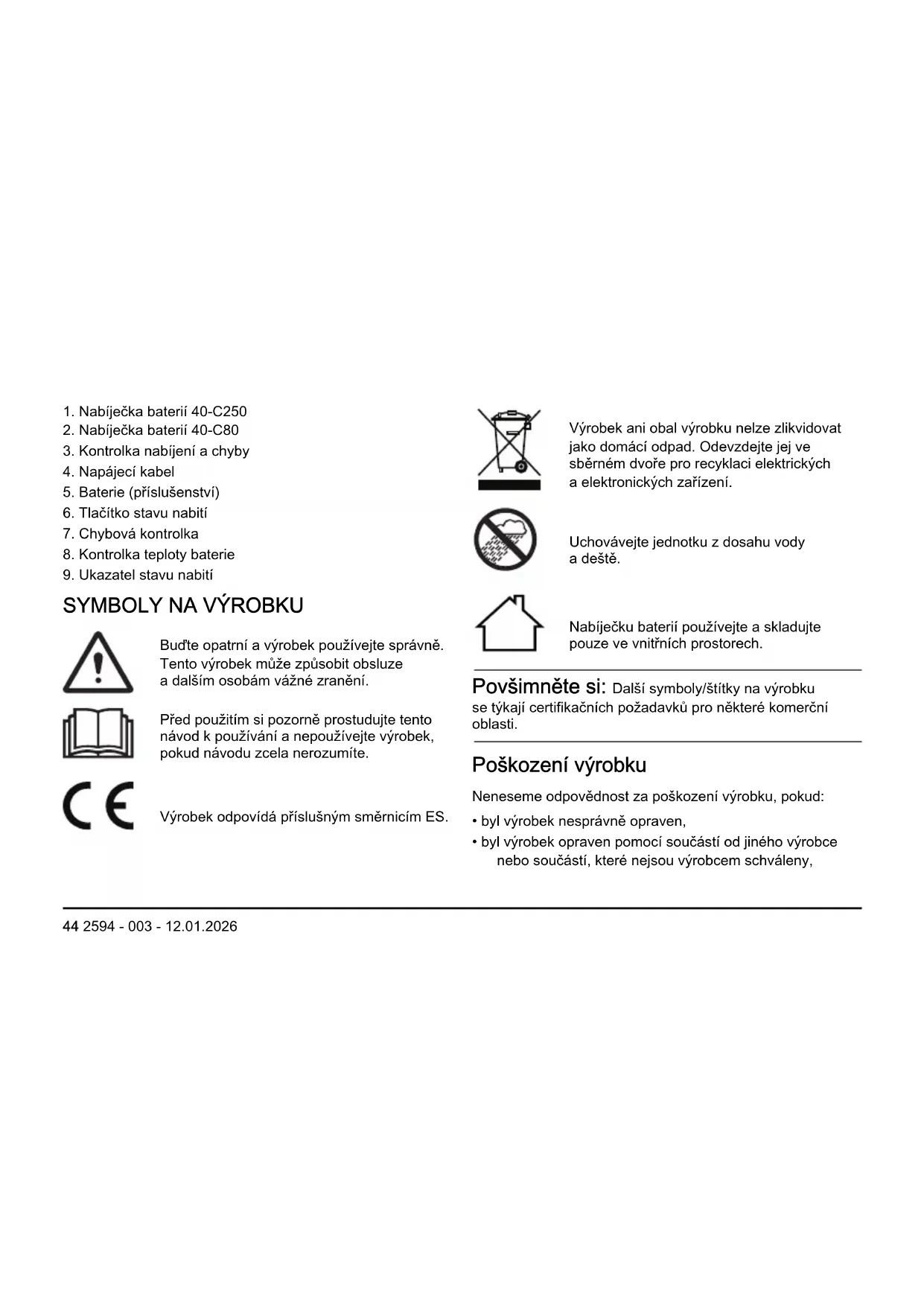 - byl výrobek opraven pomocí součástí od jiného výrobce nebo součástí, které nejsou výrobcem schváleny, 44 2594 - 003 - 12.01.2026• má výrobek příslušenství od jiného výrobce nebo příslušenství, které není výrobcem schváleno,