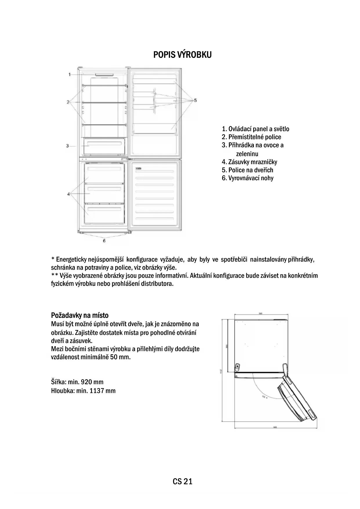 - Energeticky nejúspornější konfigurace vyžaduje, aby byly ve spotřebiči nainstalovány přihrádky, schránka na potraviny a police, viz obrázky výše. ** Výše vyobrazené obrázky jsou pouze informativní. Aktuální konfigurace bude záviset na konkrétním fyzickém výrobku nebo prohlášení distributora. Požadavky na místo Musí být možné úplně otevřít dveře, jak je znázorněno na obrázku. Zajistěte dostatek místa pro pohodlné otvírání dveří a zásuvek. Mezi bočními stěnami výrobku a přilehlými díly dodržujte vzdálenost minimálně 50 mm. Šířka: min. 920 mm Hloubka: min. 1137 mmCS 22