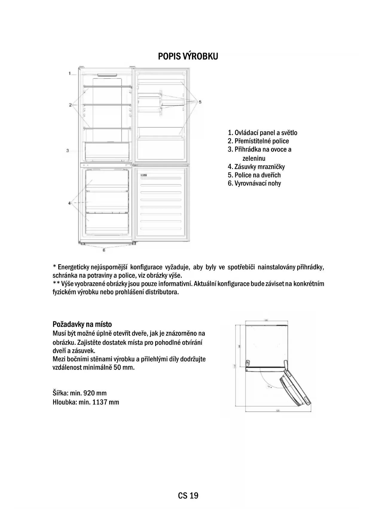 - Energeticky nejúspornější konfigurace vyžaduje, aby byly ve spotřebiči nainstalovány přihrádky, schránka na potraviny a police, viz obrázky výše. ** Výše vyobrazené obrázky jsou pouze informativní. Aktuální konfigurace bude záviset na konkrétním fyzickém výrobku nebo prohlášení distributora. Požadavky na místo Musí být možné úplně otevřít dveře, jak je znázorněno na obrázku. Zajistěte dostatek místa pro pohodlné otvírání dveří a zásuvek. Mezi bočními stěnami výrobku a přilehlými díly dodržujte vzdálenost minimálně 50 mm. Šířka: min. 920 mm Hloubka: min. 1137 mmCS 20