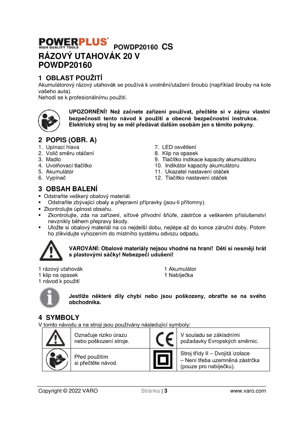 - Výstrahy, upozornění a pokyny popsané v tomto návodu k použití nemohou obsáhnout všechny možné podmínky a situace, ke kterým může dojít. Uživatel od výrobku nemůže očekávat, že nahradí použití zdravého rozumu a opatrnosti. Jejich zabezpečení je tak na uživateli.POWDP20160 CS Copyright © 2022 VARO Stránka | 7 www.varo.com 7 DOPLŇKOVÉ BEZPEČNOSTNÍ POKYNY PRO AKUMULÁTORY