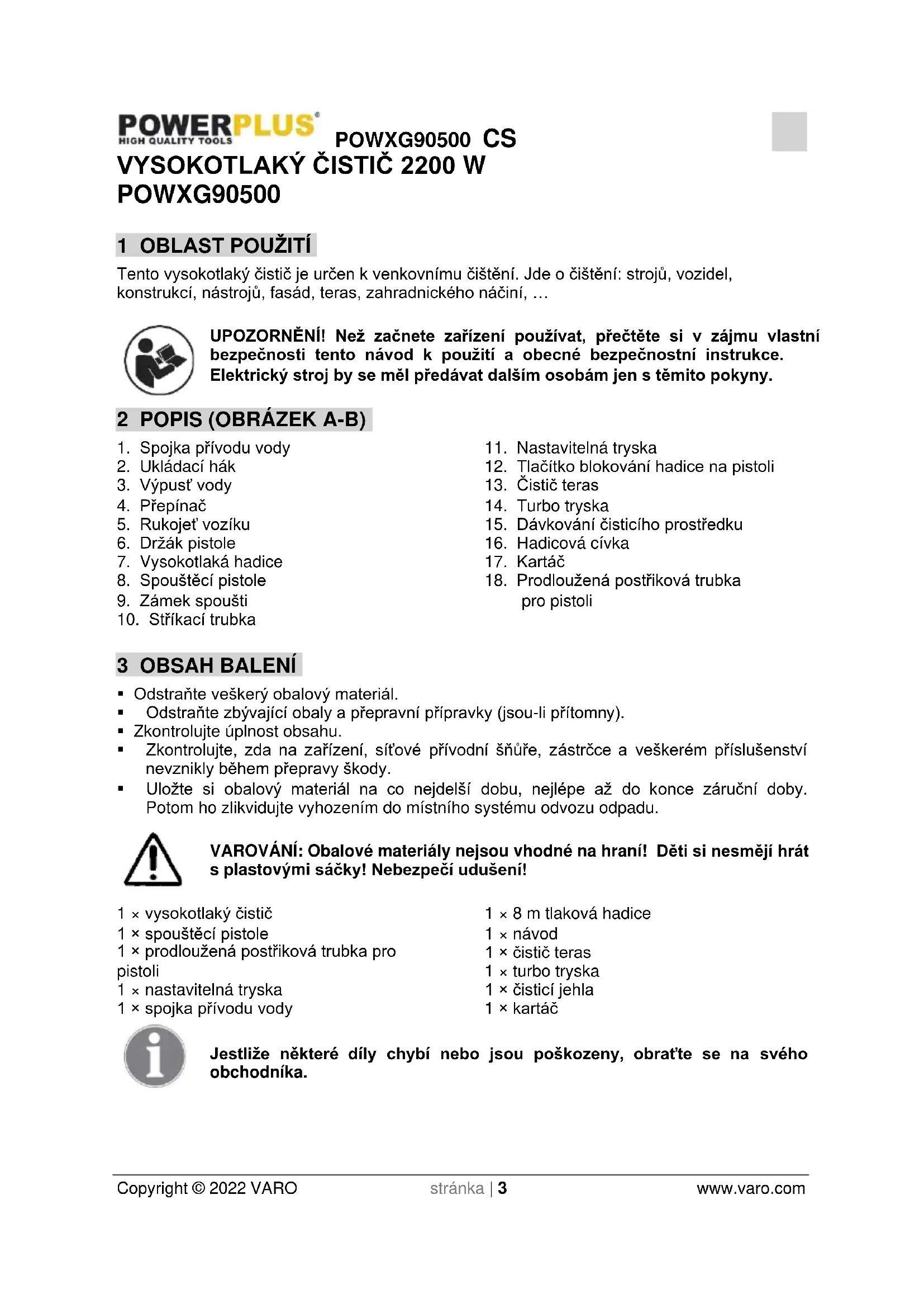 VAROVÁNI: Obalové materiały nejsou vchodné na hrani! Děti si nesměji hrát s plastovými sáčky! Nebezpečí udušeni!