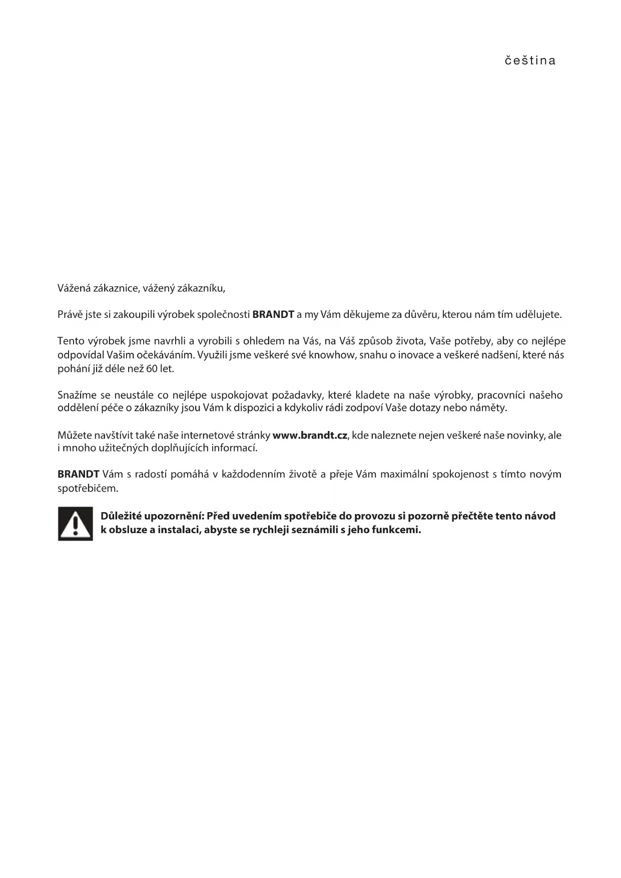 5Beskyttelse af miljøet Dette symbol angiver at dette apparat ikke må behandles som almindeligt husholdningsaffald. Apparatet indeholder mange materialer, der kan genbruges. Det angives med dette symbol for at vise, at brugte apparater ikke må blandes sammen med almindeligt husholdningsaffald. Kontakt teknisk forvaltning i kommunen eller forhandleren for at få at vide, hvor brugte apparater kan afleveres i nærheden af din bopæl. Genvindingen af apparater, som producenten organiserer, sker under de mest optimale betingelser i overensstemmelse med EU’s direktiv om affald af elektrisk og elektronisk udstyr. Nogle af emballagematerialerne til dette apparat kan genbruges. Du kan sørge for dette og dermed være med til at beskytte miljøet ved at bortskaffe dem på genbrugspladsen. Vi takker for dit samarbejde med hensyn til at beskytte miljøet. 7Vážená zákaznice, vážený zákazníku, Právě jste si zakoupili výrobek společnosti BRANDT a my Vám děkujeme za důvěru, kterou nám tím udělujete. Tento výrobek jsme navrhli a vyrobili s ohledem na Vás, na Váš způsob života, Vaše potřeby, aby co nejlépe odpovídal Vašim očekáváním. Využili jsme veškeré své knowhow, snahu o inovace a veškeré nadšení, které nás pohání již déle než 60 let. Snažíme se neustále co nejlépe uspokojovat požadavky, které kladete na naše výrobky, pracovníci našeho oddělení péče o zákazníky jsou Vám k dispozici a kdykoliv rádi zodpoví Vaše dotazy nebo náměty. Můžete navštívit také naše internetové stránky www.brandt.cz, kde naleznete nejen veškeré naše novinky, ale i mnoho užitečných doplňujících informací. BRANDT Vám s radostí pomáhá v každodenním životě a přeje Vám maximální spokojenost s tímto novým spotřebičem. Důležité upozornění: Před uvedením spotřebiče do provozu si pozorně přečtěte tento návod k obsluze a instalaci, abyste se rychleji seznámili s jeho funkcemi. češtinaBEZPEČNOSTNÍ POKYNY DŮLEŽITÉ: BEZPEČNOSTNÍ POKYNY SI PŘED POUŽITÍM POZORNĚ PŘEČTĚTE A USCHOVEJTE PRO BUDOUCÍ POUŽITÍ. Tento návod je k dispozici ke stažení na internetových stránkách značky. Tento spotřebič mohou používat děti a osoby s omezenými tělesnými, smyslovými nebo duševními schopnostmi nebo s nedostatkem zkušeností a znalostí, pouze pokud na ně dohlíží osoba zodpovědná za jejich bezpečnost. Děti si nesmějí hrát s přístrojem. Čištění a údržbu spotřebiče nesmějí provádět děti bez dohledu. Udržujte děti v bezpečné vzdálenosti od spotřebiče. Děti se nesmí pohybovat v blízkosti spotřebiče bez dozoru. Spotřebič a jeho přístupné části se během provozu zahřívají. Je nutno přijmout taková opatření, aby nedošlo k dotyku nechráněných částí těla s horkou varnou zónou spotřebiče. Kovové předměty jako nože, vidličky, lžíce a pokličky nepokládejte na desku, mohou se rozehřát na velmi vysokou teplotu. Varná deska je vybavena dětskou pojistkou, která ji zablokuje v poloze vypnutí nebo v poloze vaření (viz odd. 4.4 Dětský zámek). Tento spotřebič splňuje požadavky všech Evropským směrnic a předpisů, jimž podléhá (elektromagnetické rušení). Aby však nedocházelo k interferencím mezi varnou deskou a Vaším kardiostimulátorem, musí být také kardiostimulátor vyroben a seřízen podle všech platných pravidel a předpisů. Informujte se v případě pochybnosti u výrobce kardiostimulátoru nebo ošetřujícího lékaře. Vaření s olejem nebo tukem na varné desce prováděné bez dohledu může být nebezpečné a může vést k požáru. NIKDY se však nesnažte uhasit takto vzniklý oheň vodou, vypněte vždy nejprve napájení spotřebiče a plamen překryjte například pokličkou nebo protipožární (hasicí) dekou. POZOR: Veškerou přípravu na varné desce je nutné mít neustále pod dohledem. I krátké vaření vyžaduje nepřetržitý dohled! Nebezpečí požáru: na varné desce neskladujte žádné předměty. Objeví-li se na povrchu varné desky porasklina, je zapotřebí spotřebič odpojit od zdroje napájení, aby nedošlo k zásahu elektrickým proudem. Do výměny skleněné horní plochy již přístroj nepoužívejte. Zabraňte nárazům a tření nádob: sklokeramická plocha je velmi odolná, nikoliv však nezničitelná.Nepokládejte na varnou desku horkou pokličku. Existuje riziko, že by efekt „baňky“ vážně poškodil desku. Netřete nádobí o povrch varné desky, ale při jejich přesunech nádoby vždy zvedejte a pokládejte na nová místa, udržíte tak povrchovou úpravu (dekorativní prvky) sklokeramické desky dlouhodobě v perfektním stavu. Při přípravách nepoužívejte alobal. Nikdy nepokládejte na varnou desku potraviny zabalené v alobalu nebo v hliníkové vaničce. Hliník by se na horkém povrchu roztavil a nevratně by poškodil varnou desku. Neuchovávejte ve skříňce pod varnou deskou čistící nebo hořlavé prostředky a látky. Pokud je poškozen napájecí kabel, musí jej vyměnit výrobce (resp. dodavatel), popř. jejich autorizovaný poprodejní servis nebo osoba s podobnou kvalikací a oprávněním, tak aby se vyloučilo jakékoli riziko ohrožení zdraví a majetku uživatelů. Zkontrolujte, zda se přívodní kabel jiného elektrického přístroje, připojeného a provozovaného, v blízkosti varné desky nedotýká jejich varných zón. K údržbě desky nepoužívejte parní čistič. Přístroj není určen k uvádění do provozu prostřednictvím externího časového spínače nebo ovládání prostřednictvím samostatného dálkového ovladače.