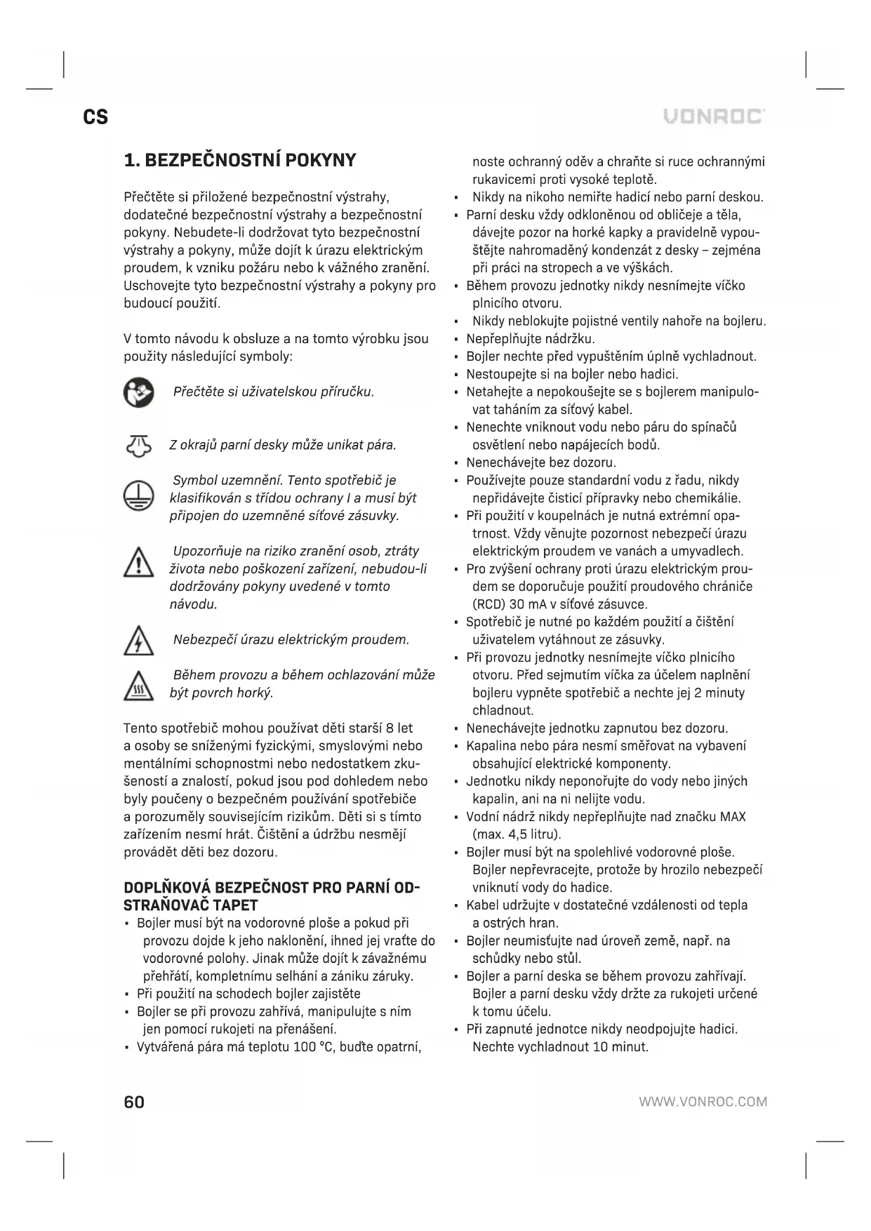 Vtomto návodu kobsluze ana tomto výrobku jsou použity následující symboly: Přečtěte si uživatelskou příručku. Zokrajů parní desky může unikat pára. Symbol uzemnění. Tento spotřebič je klasifikován střídou ochrany Iamusí být připojen do uzemněné síťové zásuvky. Upozorňuje na riziko zranění osob, ztráty života nebo poškození zařízení, nebudou-li dodržovány pokyny uvedené vtomto návodu. Nebezpečí úrazu elektrickým proudem. Během provozu aběhem ochlazování může být povrch horký. Tento spotřebič mohou používat děti starší 8 let aosoby se sníženými fyzickými, smyslovými nebo mentálními schopnostmi nebo nedostatkem zku- šeností aznalostí, pokud jsou pod dohledem nebo byly poučeny obezpečném používání spotřebiče aporozuměly souvisejícím rizikům. Děti si stímto zařízením nesmí hrát. Čištění aúdržbu nesmějí provádět děti bez dozoru. DOPLŇKOVÁ BEZPEČNOST PRO PARNÍ OD-