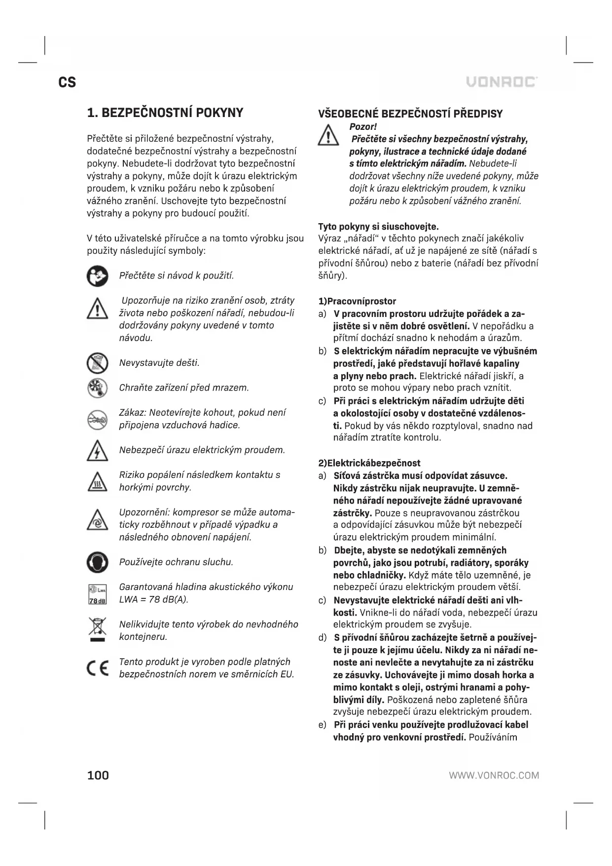- Byly použity neoriginální náhradní díly. Výše uvedené představuje jedinou záruku poskyto- vanou společností, ať už výslovnou nebo před- pokládanou. Neexistují žádné další záruky, výslovné ani nebo předpokládané, které přesahují rámec zde uvedeného, včetně předpokládaných záruk prodejnosti a vhodnosti pro určitý účel. VONROC v žádném případě neodpovídá za jakékoliv náhodné nebo následné škody. Opravné prostředky prodejců se omezují výhradně na opravu nebo výměnu ne- vyhovujících jednotek nebo dílů. Na tomto výrobku a v tomto návodu mohou být prováděny změny. Technické údaje mohou být změněny bez předchozího upozornění.108109110111