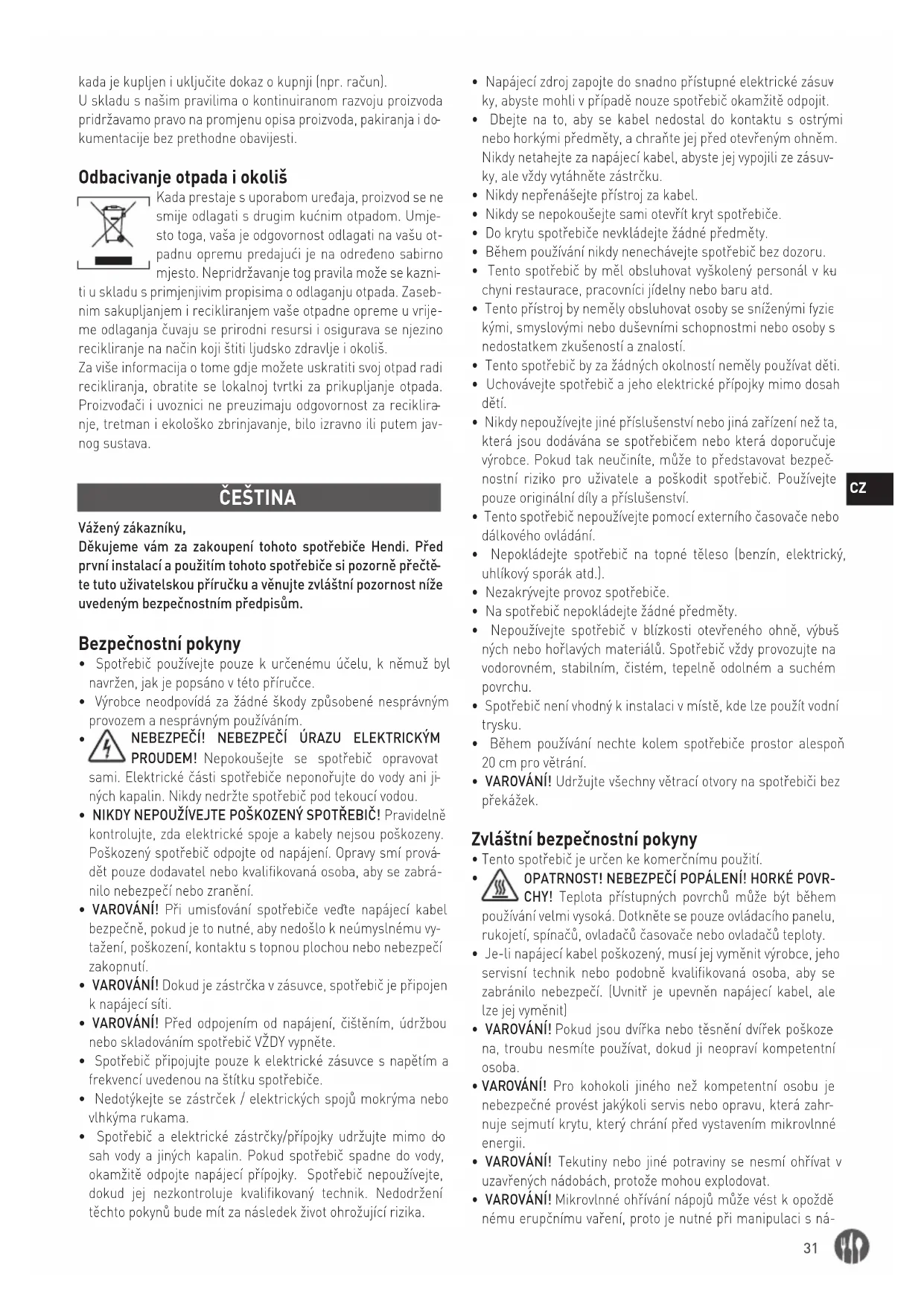 nje, tretman i ekološko zbrinjavanje, bilo izravno ili putem jav- nog sustava. ČEŠTINA Vážený zákazníku, Děkujeme vám za zakoupení tohoto spotřebiče Hendi. Před první instalací a použitím tohoto spotřebiče si pozorně přečtě