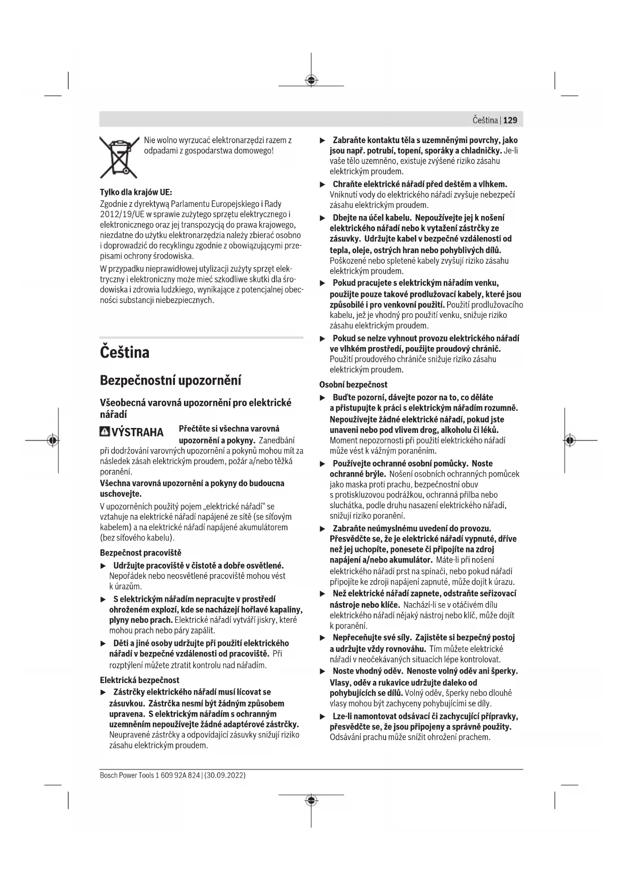 Úroveň vibrací uvedená vtěchto pokynech byla změřena pomocí normované měřicí metody alze ji použít pro vzájemné porovnání elektronářadí. Hodí se ipro předběžný odhad zatížení vibracemi. Uvedená úroveň vibrací reprezentuje hlavní použití elektronářadí. Pokud se ovšem bude elektronářadí používat pro jiné práce, sjinými nástroji nebo snedostatečnou údržbou, může se úroveň vibrací lišit. To může zatížení vibracemi po celou pracovní dobu zřetelně zvýšit. Pro přesný odhad zatížení vibracemi by měly být zohledněny idoby, kdy je nářadí vypnuté nebo sice běží, ale fakticky se nepoužívá. To může zatížení vibracemi po celou pracovní dobu zřetelně snížit. Stanovte dodatečná bezpečnostní opatření kochraně obsluhy před účinky vibrací, jako je např. údržba elektronářadí anástrojů, udržování teplých rukou, organizace pracovních procesů. Montáž Montáž ochranného zařízení u Před každou prací na elektronářadí vytáhněte zástrčku ze zásuvky. Upozornění: Po prasknutí brusného kotouče během provozu nebo při poškození upínacích přípravků na ochranném krytu/ na elektronářadí se musí elektronářadí neprodleně zaslat zákaznickému servisu, adresy viz část „Zákaznická aporadenská služba“. Bosch Power Tools 1 609 92A 824 | (30.09.2022)134 | Čeština Ochranný kryt pro broušení Nasaďte ochranný kryt (6) na krk vřetena. Nastavte polohu ochranného krytu (6) podle požadavků příslušné práce azajistěte ochranný kryt (6) zajišťovacím šroubem (7). u Ochranný kryt (6) nastavte tak, aby jiskry nelétaly směrem kpracovníkovi. Ochranný kryt pro dělení u Při dělení sbrusivem spojivem používejte vždy ochranný kryt pro dělení (14). u Při dělení kamene zajistěte dostatečné odsávání prachu. Ochranný kryt pro dělení (14) se montuje stejně jako ochranný kryt pro broušení (6). Odsávací kryt pro dělení svodicími saněmi Při montáži odsávacího krytu pro dělení svodicími saněmi(23) dodržujte návod kobsluze odsávacího krytu.. Přídavná rukojeť u Elektrické nářadí používejte pouze spřídavnou rukojetí (3). Přídavnou rukojeť (3) našroubujte na hlavu převodovky vzávislosti na způsobu práce vpravo nebo vlevo. Ochrana rukou u Pro práci sgumovým brusným talířem (18) nebo shrncovým kartáčem/ kotoučovým kartáčem/ vějířovým brusným kotoučem vždy namontujte ochranu rukou (16). Ochranu rukou (16) upevněte pomocí přídavné rukojeti (3). Montáž brusných nástrojů u Před každou prací na elektronářadí vytáhněte zástrčku ze zásuvky. u Nedotýkejte se brusných arozbrušovacích kotoučů, dokud nevychladnou. Kotouče se při práci silně zahřívají. Vyčistěte brusné vřeteno (5) avšechny díly, které budete montovat. Pro upnutí auvolnění brusných nástrojů stiskněte aretační tlačítko vřetena (1), abyste brusné vřeteno zablokovali. u Aretační tlačítko vřetena ovládejte, jen když je brusné vřeteno zastavené. Jinak se může elektronářadí poškodit. Brusný/dělicí kotouč Dbejte na rozměry brusných nástrojů. Průměr otvoru musí odpovídat upínací přírubě. Nepoužívejte adaptéry ani redukce. Při používání diamantových dělicích kotoučů dbejte na to, aby se šipka směru otáčení na diamantovém dělicím kotouči shodovala se směrem otáčení elektrického nářadí (viz šipku směru otáčení na převodové hlavě). Pořadí při montáži je vyobrazené na stránce sobrázky. Pro upevnění brusného/dělicího kotouče našroubujte upínací matici(10) autáhněte ji kolíkovým klíčem (viz „Rychloupínací matice “, Stránka134). u Po montáži brusného nástroje před zapnutím zkontrolujte, zda je brusný nástroj správně namontovaný azda se může volně otáčet. Zajistěte, aby se brusný nástroj nedotýkal ochranného krytu nebo dalších dílů. Vupínací přírubě (8) je okolo středicího nákružku nasazený plastový díl (těsnicí kroužek). Pokud těsnicí kroužek chybí nebo je poškozený, musí se upínací příruba (8) před dalším používáním bezpodmínečně vyměnit. Vějířový brusný kotouč u Při práci svějířovým brusným kotoučem vždy namontuje ochranu rukou (16). Gumový brusný talíř u Při práci sgumovým brusným talířem (18) vždy namontuje ochranu rukou (16). Pořadí při montáži je vyobrazené na stránce sobrázky. Před montáží gumového brusného talíře (18) nasaďte dvě distanční podložky (17) na brusné vřeteno (5). Našroubujte kruhovou matici (20) autáhněte ji kolíkovým klíčem. Hrncový kartáč/ kotoučový kartáč u Při práci shrncovým kartáčem nebo kotoučovým kartáčem vždy namontuje ochranu rukou (16). Pořadí při montáži je vyobrazené na stránce sobrázky. Hrncový kartáč/ kotoučový kartáč musí být možné na brusné vřeteno našroubovat natolik, aby pevně doléhal kpřírubě brusného vřetena na konci závitu brusného vřetena. Utáhněte hrncový kartáč/ kotoučový kartáč stranovým klíčem. Rychloupínací matice Pro jednoduchou výměnu brusného vřetena bez použití dalších nástrojů můžete místo upínací matice (10) použít rychloupínací matici (12). u Rychloupínací matice(12) se smí používat pouze pro brusné nebo dělicí kotouče nebo kotoučové kartáče sprůměrem otvoru 22,2mm. Používejte pouze bezvadné, nepoškozené rychloupínací matice (12). Při našroubování dbejte na to, aby popsaná strana rychloupínací matice (12) nesměřovala kbrusnému kotouči; šipka musí ukazovat na indexovou značku (24). 1 609 92A 824 | (30.09.2022) Bosch Power ToolsČeština | 135 (24) Stiskněte aretační tlačítko vřetena (1), abyste brusné vřeteno zablokovali. Pro utažení rychloupínací matice otáčejte silou brusným kotoučem po sm