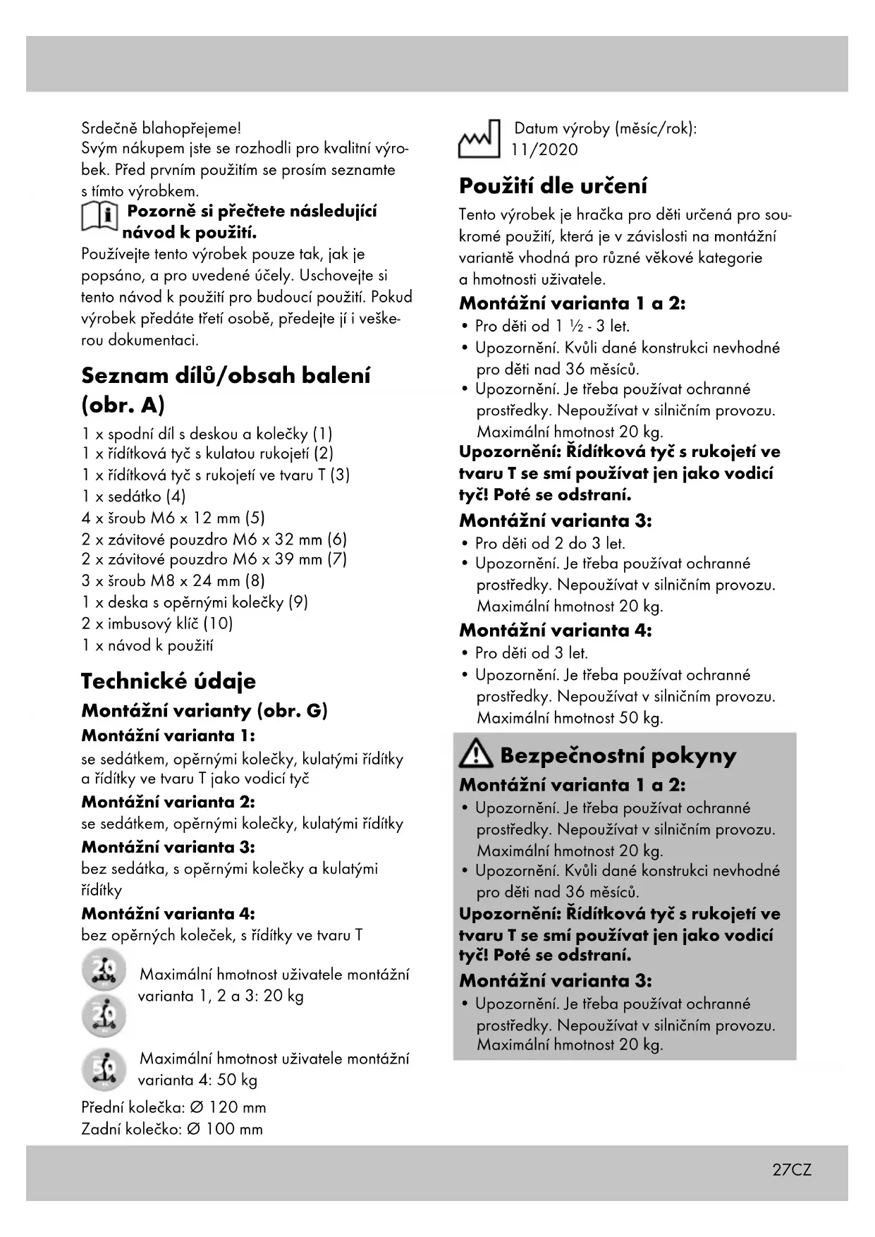 - Při používání výrobku se vyvarujte míst potřísněných vodou či olejem a velmi hrubých povrchů a povrchů s výtluky. Montáž Montáž řídítkové tyče (obr. B) Potřebujete spodní díl (1) a pro montážní variantu 1, 2 a 3 řídítkovou tyč s kulatou rukojetí (2) a pro montážní variantu 4 řídítkovou tyč s rukojetí ve tvaru T (3). Stiskněte kolík (2a, 3a) a zasuňte řídítkovou tyč do spodního dílu. Důležité: Dbejte na to, aby řídítková tyč ve spodním dílu zaskočila. Montáž varianty 1 a 2 (obr. C) Položte sedátko (4) na spodní díl (1). Dbejte na to, aby otvory sedátka a spodní části ležely nad sebou. Prostrčte krátká pouzdra (6) shora oběma předními otvory a zafixujte je zespodu pomocí šroubů (5). Prostrčte dlouhá pouzdra (7) shora oběma zadními otvory sedátka a zadními otvory desky s opěrnými kolečky (9). Zafixujte je zespodu dvěma šrouby (5). Na- šroubujte do předního otvoru desky s opěrnými kolečky šroub (8) a utáhněte ho (obr. D). K montáži použijte dodané imbusové klíče (10) a všechny šrouby a pouzdra zajistěte. Upozornění: Řídítkovou tyč s rukojetí ve tvaru T lze u montážní varianty 1 použít jako vodicí tyč. Zatlačte kolík (3a) řídítkové tyče s rukojetí ve tvaru T (3) dovnitř a zasuňte řídítkovou tyč s rukojetí ve tvaru T (3) do otvoru v sedátku (4). Kolíček (3a) musí slyšitelně zaskočit. Montáž varianty 3 (obr. E) Připevněte desku s opěrnými kolečky (9) ve třech zadních otvorech pomocí šroubů (8) a šrouby utáhněte dodanými imbusovými klíči (10). Výškové nastavení sedátka (obr. F) Sedátko lze nastavit v různých výškách od cca 26 do 32 cm. Za tímto účelem povolte zajišťovací šroub (4a) a nastavte požadovanou výšku. Zajišťovací šroub opět utáhněte. CZ29CZ Po výměně: Ujistěte se, že jsou šrouby po prvních minutách jízdy ještě utažené a že se ne- uvolnily nebo nepovolily. Kolečko ještě jednou utáhněte, abyste zajistili, že poběží klidně. Uskladnění, čištění Po použití doporučujeme výrobek důkladně vyčistit a vysušit. Odstraňte malé kamínky nebo jiné předměty, které eventuálně uvízly na kolečkách. Výrobek vždy uchovávejte na suchém místě. Pokyny k likvidaci Výrobek a obalový materiál likvidujte do odpa- du podle aktuálních místních předpisů. Obalový materiál, jako např. fóliové sáčky, nepatří do dětských rukou. Obalový materiál uchovávejte z dosahu dětí. Zlikvidujte produkty a balení ekologicky. Recyklační kód identifikuje různé materiály pro recyklaci. Kód se skládá z recyklačního symbolu - který indikuje recyklační cyklus - a čísla identifikujícího materiál. Pokyny k záruce a průběhu služby Produkt byl vyrobený s velkou pečlivostí a byl průběžně kontrolovaný ve výrobní procesu. Na tento produkt obdržíte tříroční záruku ode dne zakoupení. Uschovejte si pokladní stvrzenku. Záruka se vztahuje jen na vady materiálu a chyby z výroby, nevztahuje se na závady způso- bené neodborným zacházením nebo použitím k jinému účelu. Tato záruka neomezuje Vaše zákonná ani záruční práva. Při případných reklamacích se obraťte na dole uvedenou servisní horkou linku nebo nám zašlete email. Náš servisní pracovník s Vámi co nejrychleji upřesní další postup. V každém případě Vám osobně poradíme. Demontáž Demontáž řídítkových tyčí Stiskněte na zadní straně spodního dílu kolík (2a, 3a) a vytáhněte řídítkovou tyč (obr. B). Pro odstranění řídítkové tyče ze sedátka stiskněte kolík (3a) a vytáhněte řídítkovou tyč. Demontáž sedátka (obr. C) Povolte šrouby a stáhněte závitová pouzdra. Odejměte sedátko. Použití Jízda V závislosti na montážní variantě se posaďte na sedátko a pravidelným odrážením oběma nohama uveďte výrobek do pohybu, nebo u varianty bez sedátka postavte jednu nohu na desku a druhou nohou se pravidelně odrážejte, abyste se dali do pohybu. Výrobek se ovládá přenášením váhy. Brzdění U montážní varianty se sedátkem se brzdí položením obou nohou na zem. Při použití bez sedátka se při brzdění šlápne nohou na třecí brzdu na zadní kolečku. Údržba Výměna předních koleček Přední kolečka můžete vyměnit. Důležité! Dbejte na technické údaje. Kolečka, která mají jiný průměr, mohou změnit jízdní vlastnosti a za určitých okolností vést k ohrožení uživatele. Nepoužívejte kolečka, která nelze bez problémů namontovat. Nikdy nemontujte větší kolečka, než byla původní kolečka výrobku. Kolečka se opotřebovávají. Toto opotřebení je závislé na mnoha faktorech, jako je povrch, výška a hmotnost uživatele, povětrnostní pod- mínky, materiál koleček a jejich tvrdost. Z tohoto důvodu je nutné kolečka občas vyměnit.