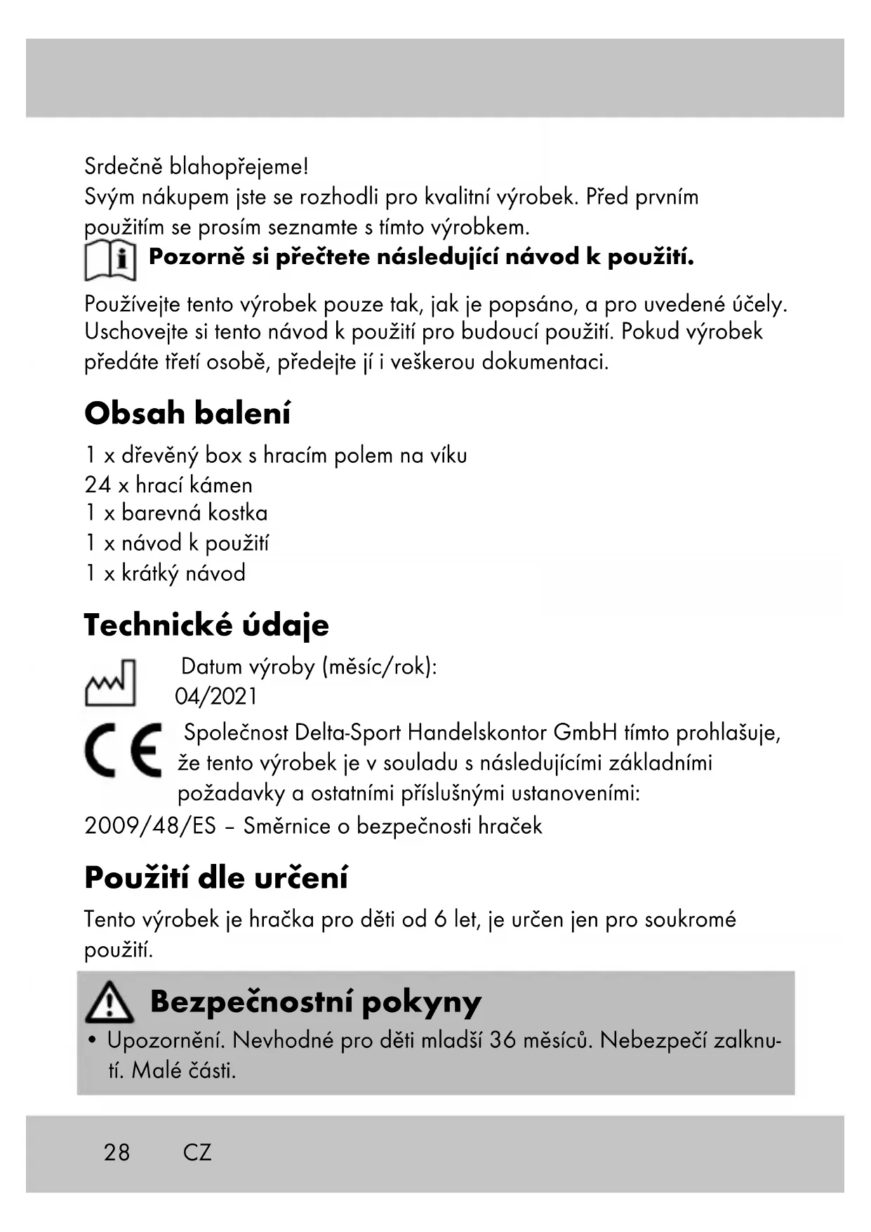 - Vyhrává hráč, který získá nejvíce hracích kamenů. Uskladnění, čištění Pokud výrobek nepoužíváte, skladujte jej vždy suchý a čistý při pokojové teplotě. Utírejte pouze suchým hadříkem. DŮLEŽITÉ! K čištění nikdy nepoužívejte agresivní čisticí prostředky.30 Pokyny k likvidaci Výrobek a obalový materiál likvidujte do odpadu podle aktuálních místních předpisů. Obalový materiál, jako např. fóliové sáčky, nepatří do dětských rukou. Obalový materiál uchovávejte z dosahu dětí. Zlikvidujte produkty a balení ekologicky. Recyklační kód identifikuje různé materiály pro recyklaci. Kód se skládá z recyklačního symbolu - který indikuje recyklační cyklus - a čísla identifikujícího materiál. Pokyny k záruce a průběhu služby Výrobek byl vyroben s velkou péčí a za stálé kontroly. DELTA-SPORT HANDELSKONTOR GmbH poskytuje koncovým privátním zákazníkům na tento výrobek tři roky záruky od data nákupu (záruční lhůta) podle následující ustanovení. Záruka se týká pouze vad materiálu a závad ve zpracování. Záruka se nevztahuje na díly, které podléhají normálnímu opotřebení, a proto je nutné na ně pohlížet jako na rychle opotřebitelné díly (např. baterie), a na křehké díly, např. vypínače, akumulátory nebo díly vyrobené ze skla. Nároky z této záruky jsou vyloučeny, pokud výrobek byl používán neodborně nebo nedovoleným způsobem nebo nikoli v rámci stanovené- ho účelu určení nebo předpokládaného rozsahu používání nebo nebyla dodržena zadání v návodu k obsluze, ledaže by koncový zákazník prokázal, že existuje vada materiálu nebo došlo k chybě ve zpracování, které nevyplývají z některé výše uvedených okolností. Nároky ze záruky lze uplatnit pouze v rámci záruční lhůty po předložení originálního pokladního dokladu. Proto si prosím uschovejte originál po- kladního dokladu. Doba záruky se neprodlužuje případnými opravami na základě záruky, zákonné záruky nebo kulance. Totéž platí také pro vyměněné a opravené díly. CZ31CZ Při reklamacích se prosím obracejte na níže uvedenou horkou linku servi- su nebo se s námi spojte e-mailem. Pokud se vyskytne případ reklamace, výrobek Vám – dle naší volby – bezplatně opravíme, vyměníme nebo Vám vrátíme kupní cenu. Další práva ze záruky nevznikají. Vaše zákonná práva, zejména nároky na zajištění záruky vůči konkrét- nímu prodejci, nejsou touto zárukou omezena. IAN: 364364_2010 Servis Česko Tel.: 800143873 E-Mail: deltasport@lidl.cz32 Blahoželáme! Svojím nákupom ste sa rozhodli pre kvalitný výrobok. Pred prvým použitím sa s výrobkom dôkladne oboznámte. Pozorne si prečítajte tento návod na použivanie. Výrobok používajte len uvedeným spôsobom a na uvedený účel. Tento návod na použivanie si dobre uschovajte. Pri odovzdávaní výrobku tretej osobe odovzdajte s výrobkom aj všetky podklady. Rozsah dodávky 1 x drevený box s krytom ako hracím poľom 24 x hracia figúrka 1 x farebná kocka 1 x návod na používanie 1 x krátky návod Technické údaje Dátum výroby (mesiac/rok): 04/2021 Spoločnosť Delta-Sport Handelskontor GmbH týmto vyhlasuje, že tento výrobok je v súlade s nasledujúcimi základnými požiadavkami a ostatnými príslušnými ustanoveniami: 2009/48/ES – Smernica o bezpečnosti hračiek Určené použitie Tento výrobok je hračka pre deti od 6 rokov určená na súkromné použitie. Bezpečnostné pokyny