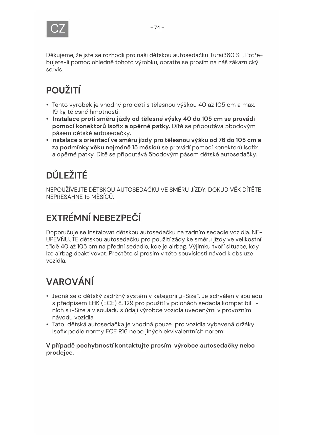 Děkujeme, že jste se rozhodli pro naši dětskou autosedačku Turai360 SL. Potře- bujete-li pomoc ohledně tohoto výrobku, obraťte se prosím na náš zákaznický servis. POUŽITÍ