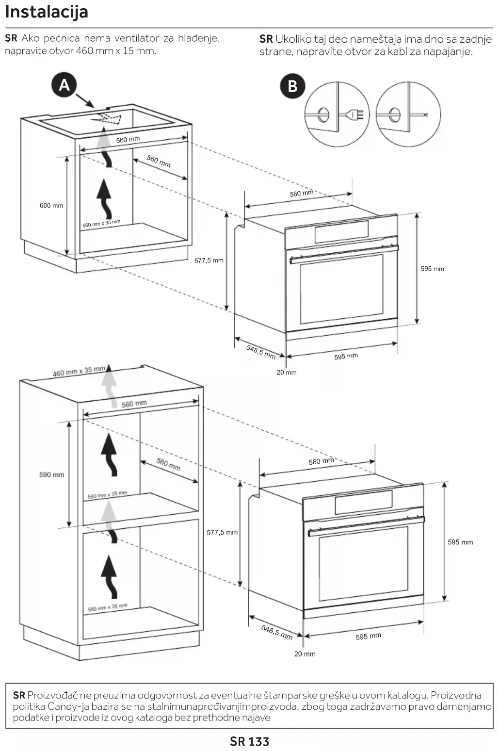 Upozornění: Ujistěte se, že je spotřebič chladný, než se ho dotknete. Je nutné dávat pozor na všechny horké povrchy, protože hrozí nebezpečí popálení. Používejte destilovanou nebo pitnou vodu. 100 mlCZ 151 Odpadové hospodářství a ochrana životního prostředí Tento spotřebič je označen v souladu s evropskou směr- nicí 2012/19/EU o odpadních elektrických a elektronických zařízeních (OEEZ). OEEZ ob- sahují jak znečišťující látky (které mohou mít negativní vliv na životní prostředí), tak i základní prvky (které mohou být znovu použity). Je důležité, aby OEEZ podstoupily zvláštní zacházení pro správné odstranění a likvidaci znečišťujících látek a obnovení všech materiálů. Jednot- livci mohou hrát významnou roli při ochran- ně životního prostředí před OEEZ; je nutné dodržovat některá základní pravidla: - S odpadními elektrickými a elektronickými zařízeními se nesmí zacházet jako s domovním odpadem; - OEEZ by měly být odvezeny do speciál- ních sběrných dvorů spravovaných místním úřadem nebo registrovanou společností. V mnoha zemích může být k dispozici vyzved- nutí velkých OEEZ u zákazníka. Když koupíte Řešení potíží Problém Možná Příčina Řešení Trouba se nezahřívá Hodiny nejsou nastaveny Nastavte hodiny Trouba se nezahřívá Dětský zámek je aktivní Deaktivujte dětský zámek Trouba se nezahříváFunkce pečení a teplota nebyly nas-tavenyPřesvědčte se, že potřebnánastavení jsou správná nový spotřebič, můžete starý odevzdat obchodníkovi, který musí bezplatně přijmout jeden starý spotřebič za jeden nový prodaný spotřebič, pokud se jedná o ekvivalentní typ se stejnými funkcemi, jaké má nový zakoupený spotřebič. Šetrnost a ohleduplnost k životnímu prostředí Kdykoli je to možné, vyhněte se předehřátí trouby a vždy se ji snažte naplnit. Otevírejte dvířka trouby co možná nejméně často, pro- tože při každém otevření uniká teplo z dutiny. Pro významnou úsporu energie vypněte trou- bu 5 až 10 minut před plánovaným koncem doby pečení a využijte zbytkové teplo, které trouba nadále generuje. Udržujte těsnění v čistotě a v pořádku, aby nedocházelo k unikání tepla z trouby. Máte-li hodinový tarif, program „zpožděné pečení“ usnadňuje úspory energie přesunutím doby vaření na dobu s nižší saz- bou.CZ 152 Instalace 560 mm560 mm590 mm560 mm x 35 mm560 mm x 35 mm 460 mm x 35 mm 595 mm560 mm548,5 mm595 mm 577,5 mm 20 mm 560 mm 560 mm 600 mm 560 mm x 35 mm 595 mm 560 mm 548,5 mm 595 mm 577,5 mm 20 mm