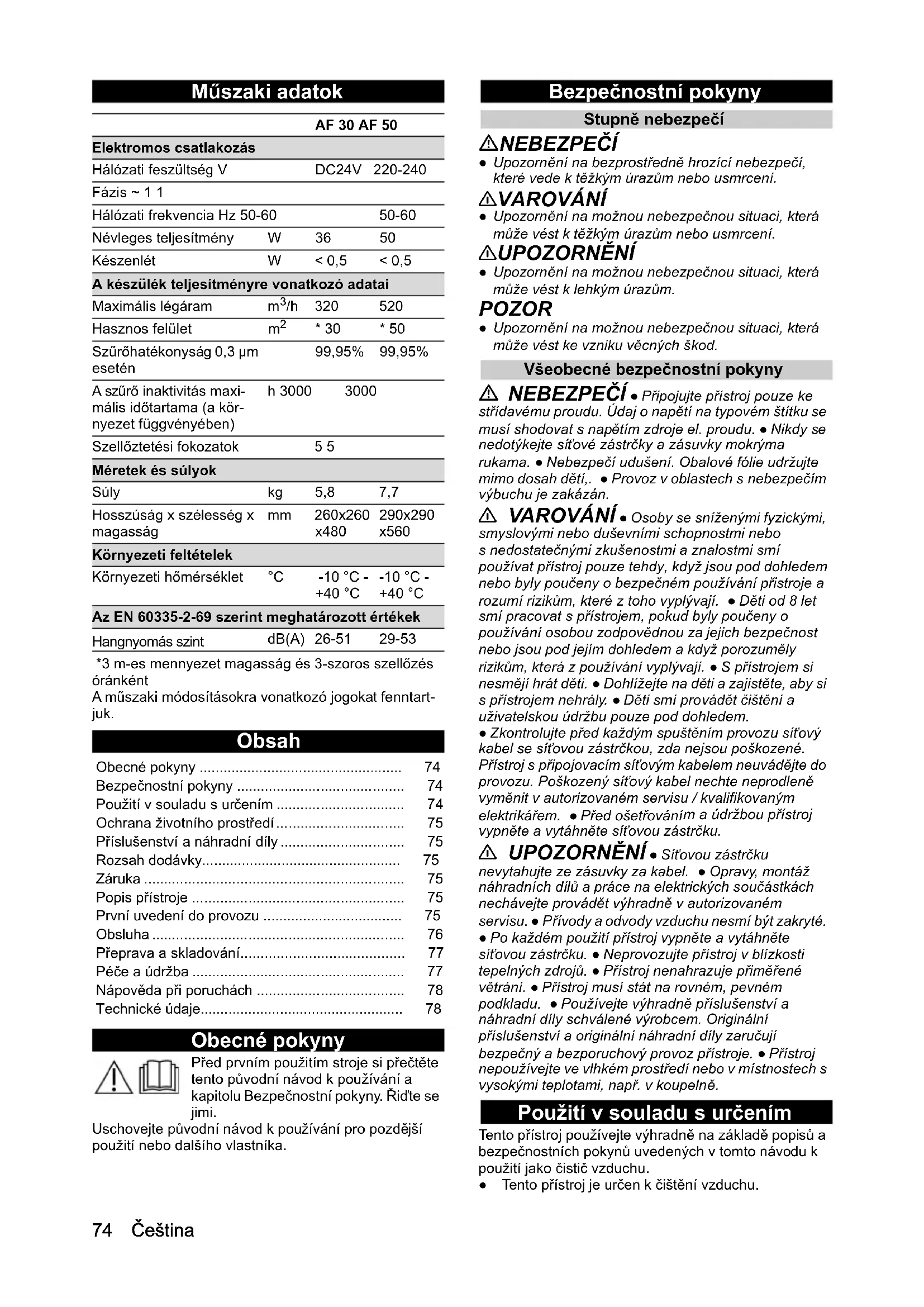Segítség üzemzavarok esetén Az üzemzavarok gyakran egyszerű okokra vezethetők vi ssza, amelyeket az alábbi áttekintés segítségével a kezelő maga is könnyen elháríthat. Kétség esetén vagy az itt meg nem nevezett üzemzavarok esetén, kérjük, forduljon a hivatalos ügyfélszolgálathoz. Hiba Ok Elhárítás A készüléket nem lehet bekapcsolni Nincs elektromos feszültség Ellenőrizze a dugaszolóaljzatot és az áramellátás biztosítékát. Csatlakoztassa a tápegységet egy másik csatlakozóaljzathoz. Meghibásodott tápegység A tápegység cseréjének céljából forduljon az ügyfélszolgálathoz. Hibás készülék Forduljon az ügyfélszolgálathoz. A kijelző villog és a ké- szülék nem aktiválódik A szűrőfedél nincs megfelelően telepítve Telepítse megfelelően a szűrőfedelet, köz- ben bizonyosodjon meg a szűrők megfele- lő elhelyezkedéséről. Csökkentett légáram Eltömődött szűrő Cserélje ki a szűrőt, lásd a fejezetet Szűrő- csere. A szűrő nincs kicsomagolva Csomagolja ki a szűrőt, lásd a(z) Első üzembe helyezés fejezetet. A ventilátorfokozat túl alacsony Növelje a ventilátor fokozatot, lásd a(z) A ventilátorfokozatok beállítása fejezetet. A levegőkimenet eltömődött Távolítsa el az idegen testeket. A szagtalanítás hatásta- lan Gyenge minőségű környezeti levegő Nyissa ki az ablakot, hatékony szellőztetés biztosításának céljából. A szűrő elhasználódott vagy túl hosszú ideig volt használatban Szűrőcsere. A ventilátorfokozat túl alacsony Növelje a ventilátor szintjét, lásd (az) A ventilátorfokozatok beállítása fejezetet. Rossz levegőminőség A ventilátorfokozat túl alacsony Növelje a ventilátorfokozatot, lásd a(z) A ventilátorfokozatok beállítása fejezetet. Huzat A készülék üzemeltetésekor csukja be az ablakokat és az ajtókat. AF 30: A zárt környezet mérete jelen- tősen nagyobb, mint 30 m² Kérjük, figyeljen a zárt környezet maximá- lis méretére. AF 50: A zárt környezet mérete jelen- tősen nagyobb, mint 50 m² Kérjük, figyeljen a zárt környezet maximá- lis méretére. A készülék levegőnyílásai blokkoltak Kérjük, biztosítsa a készülékre vonatkozó szükséges távolságokat. A készülékre bármilyen tárgyat helyezni ti- los. A szűrő nincs kicsomagolva Csomagolja ki a szűrőt, lásd a(z) Első üzembe helyezés fejezetet. A szűrő eltömődött vagy szennyezett. Cserélje ki a szűrőt, lásd a fejezetet Szűrő- csere.74 Čeština Műszaki adatok *3 m-es mennyezet magasság és 3-szoros szellőzés óránként A műszaki módosításokra vonatkozó jogokat fenntart- juk. Obsah Obecné pokyny Před prvním použitím stroje si přečtěte tento původní návod k používání a kapitolu Bezpečnostní pokyny. Řiďte se jimi. Uschovejte původní návod k používání pro pozdější použití nebo dalšího vlastníka. Bezpečnostní pokyny Stupně nebezpečí NEBEZPEČÍ ● Upozornění na bezprostředně hrozící nebezpečí, které vede k těžkým úrazům nebo usmrcení. 몇 VAROVÁNÍ ● Upozornění na možnou nebezpečnou situaci, která může vést k těžkým úrazům nebo usmrcení. 몇 UPOZORNĚNÍ ● Upozornění na možnou nebezpečnou situaci, která může vést k lehkým úrazům. POZOR ● Upozornění na možnou nebezpečnou situaci, která může vést ke vzniku věcných škod. Všeobecné bezpečnostní pokyny NEBEZPEČÍ ● Připojujte přístroj pouze ke střídavému proudu. Údaj o napětí na typovém štítku se musí shodovat s napětím zdroje el. proudu. ● Nikdy se nedotýkejte síťové zástrčky a zásuvky mokrýma rukama. ● Nebezpečí udušení. Obalové fólie udržujte mimo dosah dětí,. ● Provoz v oblastech s nebezpečím výbuchu je zakázán. 몇 VAROVÁNÍ ● Osoby se sníženými fyzickými, smyslovými nebo duševními schopnostmi nebo s nedostatečnými zkušenostmi a znalostmi smí používat přístroj pouze tehdy, když jsou pod dohledem nebo byly poučeny o bezpečném používání přistroje a rozumí rizikům, které z toho vyplývají. ● Děti od 8 let smí pracovat s přístrojem, pokud byly poučeny o používání osobou zodpovědnou za jejich bezpečnost nebo jsou pod jejím dohledem a když porozuměly rizikům, která z používání vyplývají. ● S přístrojem si nesmějí hrát děti. ● Dohlížejte na děti a zajistěte, aby si s přístrojem nehrály. ● Děti smí provádět čištění a uživatelskou údržbu pouze pod dohledem. ● Zkontrolujte před každým spuštěním provozu síťový kabel se síťovou zástrčkou, zda nejsou poškozené. Přístroj s připojovacím síťovým kabelem neuvádějte do provozu. Poškozený síťový kabel nechte neprodleně vyměnit v autorizovaném servisu / kvalifikovaným elektrikářem. ● Před ošetřování m a údržbou přístroj vypněte a vytáhněte síťovou zástrčku. 몇 UPOZORNĚNÍ ● Síťovou zástrčku nevytahujte ze zásuvky za kabel. ● Opravy, montáž náhradních dílů a práce na elektrických součástkách nechávejte provádět výhradně v autorizovaném servisu. ● Přívody a odvody vzduchu nesmí být zakryté. ● Po každém použití přístroj vypněte a vytáhněte síťovou zástrčku. ● Neprovozujte přístroj v blízkosti tepelných zdrojů. ● Přístroj nenahrazuje přiměřené větrání. ● Přístroj musí stát na rovném, pevném podkladu. ● Používejte výhradně příslušenství a náhradní díly schválené výrobcem. Originální příslušenství a originální náhradní díly zaručují bezpečný a bezporuchový provoz přístroje. ● Přístroj nepoužívejte ve vlhkém prostředí nebo v místnostech s vysokými teplotami, např. v koupelně. Použití v souladu s určením Tento přístroj používejte výhradně na základě popisů a bezpečnostních pokynů uvedených v tomto návodu k použití jako čisti