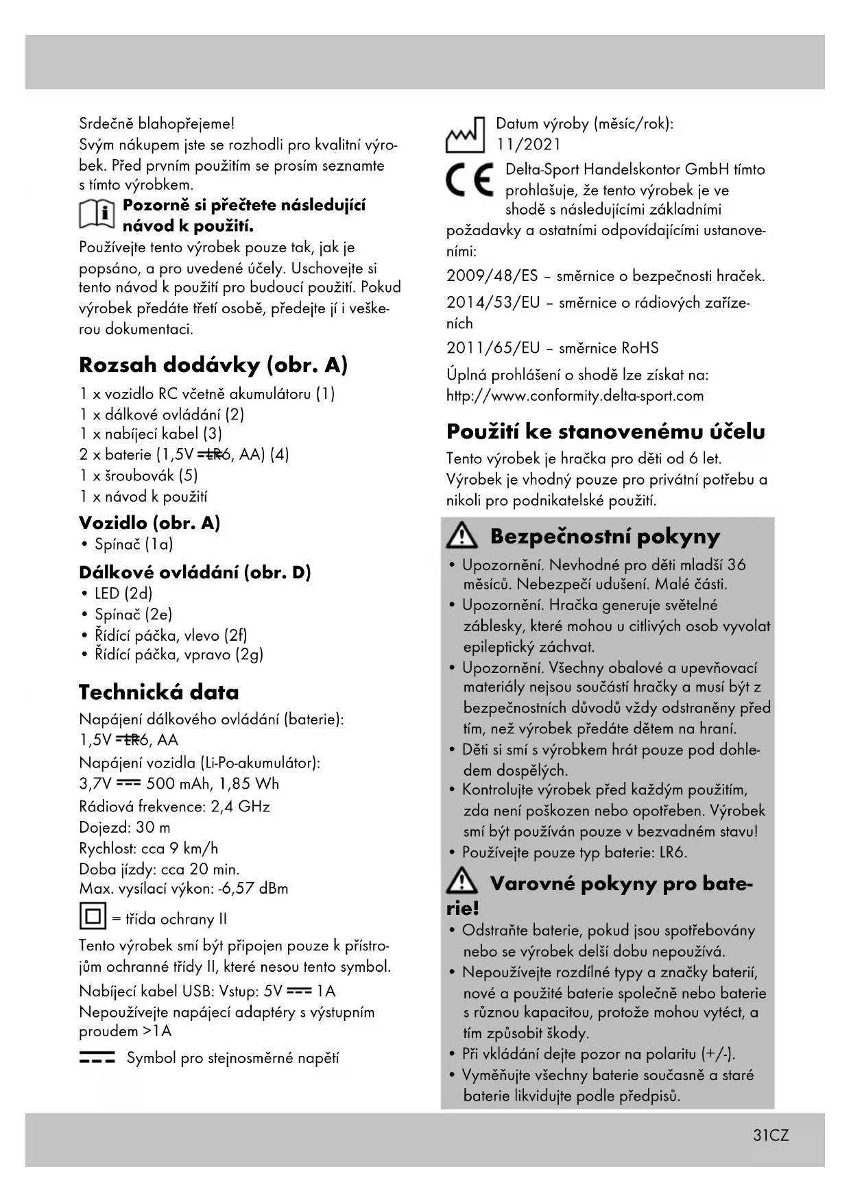 Nepoužívejte napájecí adaptéry s výstupním proudem >1A Symbol pro stejnosměrné napětí Datum výroby (měsíc/rok): 11/2021 Delta-Sport Handelskontor GmbH tímto prohlašuje, že tento výrobek je ve shodě s následujícími základními požadavky a ostatními odpovídajícími ustanove- ními: 2009/48/ES – směrnice o bezpečnosti hraček. 2014/53/EU – směrnice o rádiových zaříze- ních 2011/65/EU – směrnice RoHS Úplná prohlášení o shodě lze získat na: http://www.conformity.delta-sport.com Použití ke stanovenému účelu Tento výrobek je hračka pro děti od 6 let. Výrobek je vhodný pouze pro privátní potřebu a nikoli pro podnikatelské použití. Bezpečnostní pokyny